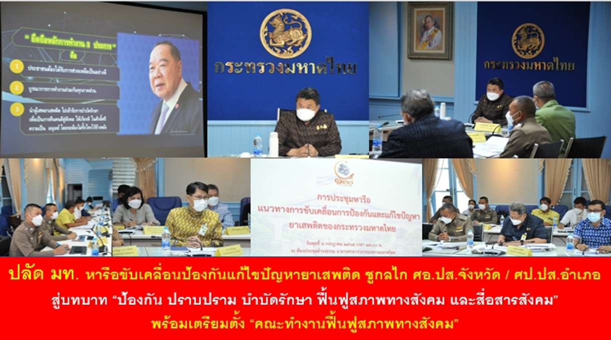 นายสุทธิพงษ์ จุลเจริญ ปลัดกระทรวงมหาดไทย ได้กล่าวต่ออีกว่า เพื่อให้การดำเนินงานด้านการป้องกัน ปราบปราม บำบัดรักษา และฟื้นฟูผู้ติดยาเสพติดเป็นไปตามนโยบายรัฐบาลและภารกิจสำคัญของกระทรวงมหาดไทยโดย “ไม่ทิ้งใครไว้ข้างหลัง” และในช่วงที่ส่วนราชการที่เกี่ยวข้องอยู่ระหว่างการจัดทำร่างอนุบัญญัติเพื่อปฏิบัติให้เป็นไปตามประมวลกฎหมายยาเสพติด กระทรวงมหาดไทยซึ่งมีกลไกการขับเคลื่อนการบริหารราชการแผ่นดินในทุกพื้นที่ของประเทศ ตั้งแต่ระดับจังหวัด อำเภอ ตำบล หมู่บ้าน/ชุมชน โดยมีผู้ว่าราชการจังหวัด และนายอำเภอเป็นแม่ทัพคนสำคัญในพื้นที่นำข้าราชการและองคาพยพของกระทรวงมหาดไทยทุกระดับ ทั้งผู้นำท้องที่ กำนัน ผู้ใหญ่บ้าน คณะกรรมการหมู่บ้าน (กม.) ผู้นำท้องถิ่น ผู้บริหารองค์กรปกครองส่วนท้องถิ่น อาสาสมัครต่าง ๆ ทั้งผู้นำอาสาพัฒนาชุมชน (ผู้นำ อช.) อปพร. ฯลฯ ต่างมีอุดมการณ์ที่มุ่งมั่นในการ “บำบัดทุกข์ บำรุงสุข” ให้กับพี่น้องประชาชน ซึ่ง “ยาเสพติด” เป็นปัญหาที่สำคัญอย่างยิ่ง ที่ส่งผลกระทบอย่างรุนแรงต่อสภาพสังคม สภาพชีวิตความเป็นอยู่ นำความเดือดร้อนไปสู่ครอบครัว ชุมชน หมู่บ้านไหน หรือครัวเรือนไหนมีผู้ติดยาเสพติด หมู่บ้านนั้นก็จะมีแต่ความวุ่นวาย ความหวาดกลัวว่าจะมีคนคุ้มคลั่ง ระแวงว่าจะมีโจรผู้ร้ายปล้นชิงข้าวของไปขายเพื่อซื้อยาเสพติด หรือหากบ้านใด ครัวเรือนใด มีลูกหลานติดยาเสพติด บ้านนั้นก็จะไม่พบกับความสุขอีกเลย เพราะวันใดลูกหลานที่ติดยาอาจจะคลุ้มคลั่งหยิบมีดมาข่มขู่ มาทำร้าย พ่อ แม่ ญาติพี่น้อง ดังนั้น ยาเสพติดจึงเป็นเรื่องที่ “รอไม่ได้” ที่จะร่วมกันกำหนดกฎเกณฑ์กติกา โดยใช้กลไกศูนย์อำนวยการป้องกันและปราบปรามยาเสพติดจังหวัด (ศอ.ปส.จังหวัด) และศูนย์ปฏิบัติการป้องกันและปราบปรามยาเสพติดอำเภอ (ศป.ปส.อำเภอ) บูรณาการหน่วยงานที่เกี่ยวข้องในระดับพื้นที่ ขับเคลื่อนแปลงนโยบายสู่การปฏิบัติให้เกิดผลเป็นรูปธรรม ด้วยความกระฉับกระเฉงว่องไวและ Active ตลอดเวลา คู่ขนานไปกับการขับเคลื่อนตามประมวลกฎหมายยาเสพติด เพื่อร่วมกันดูแลผู้หลงผิดให้กลับคืนสู่สังคมได้อย่างมีประสิทธิภาพเพิ่มมากขึ้น โดยเฉพาะอย่างยิ่งภารกิจของกระทรวงมหาดไทยในด้านการจัดตั้ง “ศูนย์ฟื้นฟูสภาพทางสังคม” ซึ่งในขณะนี้ จังหวัดและหน่วยงานที่เกี่ยวข้องได้ทำการสำรวจสถานที่ที่สามารถดำเนินการเป็นศูนย์ฟื้นฟูสภาพสังคม แบ่งเป็น ศูนย์ฟื้นฟูสภาพทางสังคมแก่ผู้ติดยาเสพติดหรือผู้ผ่านการบำบัดรักษาจังหวัด/อำเภอ และกองร้อยอาสารักษาดินแดน) จ