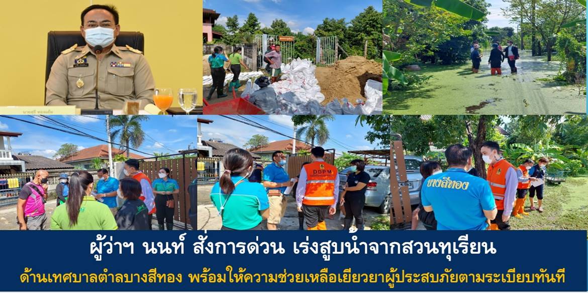 “ขณะนี้ จังหวัดนนทบุรีได้ประกาศพื้นที่ประสบสาธารณภัย/เขตการให้ความช่วยเหลือผู้ประสบภัยพิบัติกรณีฉุกเฉิน (อุทกภัย) ในพื้นที่อำเภอบางกรวย หมู่ที่ 4 ตำบลบางสีทอง อำเภอบางกรวย จังหวัดนนทบุรี เพื่อให้หน่วยงานภาครัฐ และท้องถิ่นสามารถดำเนินการตามระเบียบกฎหมายที่เกี่ยวข้อง ในการให้ความช่วยเหลือประชาชนผู้ประสบภัยไว้แล้ว ทั้งนี้ เกษตรอำเภอบางกรวยจะดำเนินการตรวจสอบผลกระทบ บริเวณพื้นที่ดังกล่าวหลังน้ำลด เพื่อให้ความช่วยเหลือต่อไป และจะดำเนินการสำรวจสวนผลไม้บริเวณพื้นที่หมู่ 4 และพื้นที่ประสบสาธารณภัยให้ครบทั้งหมด หากพี่น้องประชาชนยังไม่ได้รับการช่วยเหลือ หรือได้รับผลกระทบเพิ่มเติมซึ่งต้องการความช่วยเหลือ ขอให้แจ้งเจ้าหน้าที่ในพื้นที่ หรือ สามารถโทรศัพท์ได้ที่สายด่วนนิรภัย 1784 ได้ฟรี ตลอด 24 ชั่วโมง เพื่อเจ้าหน้าที่จะได้เร่งประสานงานและให้ความช่วยเหลือได้อย่างทันท่วงที” ผู้ว่าราชการจังหวัดนนทบุรี กล่าว