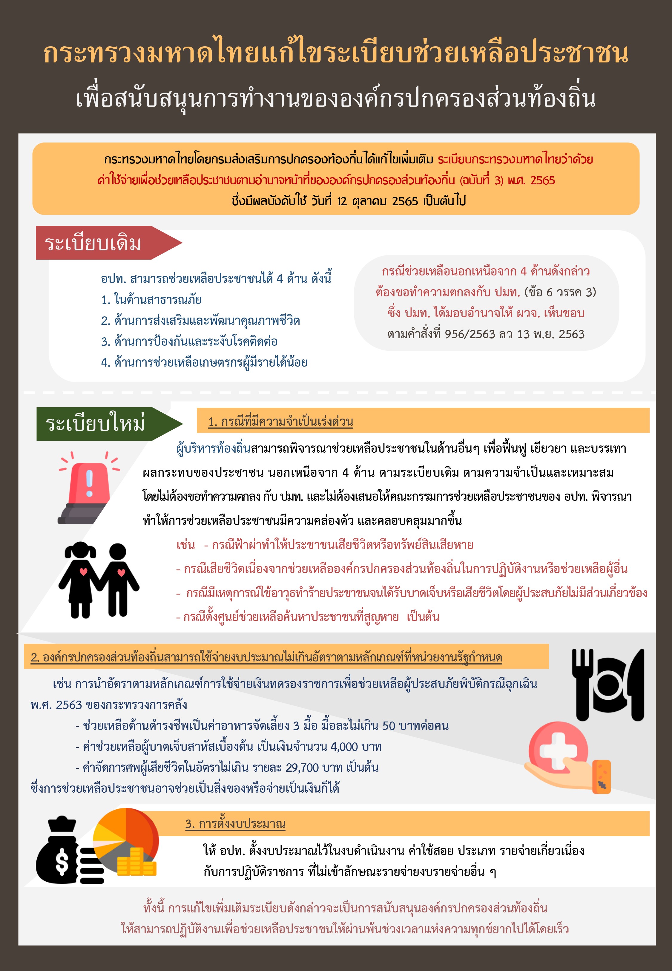 “ในขณะนี้ พลเอก อนุพงษ์ เผ่าจินดา รัฐมนตรีว่าการกระทรวงมหาดไทย ได้ลงนามประกาศใช้ระเบียบกระทรวงมหาดไทยว่าด้วยค่าใช้จ่ายเพื่อช่วยเหลือประชาชนตามอำนาจหน้าที่ขององค์กรปกครองส่วนท้องถิ่น (ฉบับที่ 3) พ.ศ.2565 ซึ่งได้มีผลบังคับใช้แล้วตั้งแต่วันที่ 12 ตุลาคม 2565 เป็นต้นมา โดยระเบียบ ฯ นี้ มีวัตถุประสงค์ที่สำคัญ เพื่อให้ผู้บริหารองค์กรปกครองส่วนท้องถิ่นสามารถพิจารณาช่วยเหลือประชาชนในกรณีที่มีความจำเป็นเร่งด่วน เพื่อฟื้นฟู เยียวยา สงเคราะห์ และบรรเทาผลกระทบของประชาชนให้ครอบคลุม รวดเร็ว และลดความล่าช้าที่เกิดขึ้นจากการที่องค์กรปกครองส่วนท้องถิ่นต้องขอทำความตกลงกับปลัดกระทรวงมหาดไทย หรือผู้ว่าราชการจังหวัด พร้อมทั้งไม่ต้องเสนอให้คณะกรรมการช่วยเหลือประชาชนขององค์กรปกครองส่วนท้องถิ่นพิจารณา เช่น กรณีฟ้าผ่าทำให้ประชาชนเสียชีวิต กรณีเสียชีวิตเนื่องจากช่วยเหลือองค์กรปกครองส่วนท้องถิ่นปฏิบัติงานหรือช่วยเหลือผู้อื่น กรณีมีเหตุการณ์ใช้อาวุธทำร้ายประชาชนจนได้รับบาดเจ็บหรือเสียชีวิตโดยผู้ประสบภัยไม่มีส่วนเกี่ยวข้อง และกรณีตั้งศูนย์ช่วยเหลือค้นหาประชาชนที่สูญหาย เป็นต้น โดยในกรณีจำเป็นเร่งด่วนในการช่วยเหลือประชาชน ผู้บริหารองค์กรปกครองส่วนท้องถิ่นก็สามารถพิจารณาให้ความช่วยเหลือประชาชนได้ตามความจำเป็น เหมาะสม ไม่เกินอัตราตามหลักเกณฑ์ที่หน่วยงานรัฐกำหนด เช่น การนำอัตราตามหลักเกณฑ์การใช้จ่ายเงินทดรองราชการเพื่อช่วยเหลือผู้ประสบภัยพิบัติกรณีฉุกเฉิน พ.ศ. 2563 ของกระทรวงการคลัง เพื่อช่วยเหลือด้านดำรงชีพเป็นค่าอาหาร จัดเลี้ยง 3 มื้อ มื้อละไม่เกิน 50 บาทต่อคน ค่าช่วยเหลือผู้บาดเจ็บสาหัสเบื้องต้น เป็นเงินจำนวน 4,000 บาท ค่าจัดการศพผู้เสียชีวิตในอัตราไม่เกินรายละ 29,700 บาท เป็นต้น ซึ่งการช่วยเหลือประชาชนอาจช่วยเป็นสิ่งของหรือจ่ายเป็นเงินก็ได้ และกรณีการใช้จ่ายเงินขององค์กรปกครองส่วนท้องถิ่นให้พิจารณาถึงผลกระทบต่อสถานะทางการคลังในการบริหารหรือการจัดการบริการสาธารณะ เพื่อประโยชน์ของประชาชนในท้องถิ่น” นายสุทธิพงษ์ฯ กล่าวเน้นย้ำ
