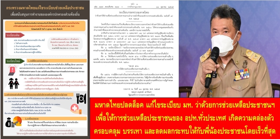 นายสุทธิพงษ์ จุลเจริญ ปลัดกระทรวงมหาดไทย กล่าวว่า เพื่อเป็นการปลดล็อคข้อจำกัดของระเบียบกระทรวงมหาดไทยฯ ดังกล่าว ลดขั้นตอนการปฏิบัติ อันจะทำให้การช่วยเหลือพี่น้องประชาชนในพื้นที่ต่าง ๆ เป็นไปอย่างมีประสิทธิภาพ และเกิดประโยชน์กับพี่น้องประชาชน จึงได้สั่งการให้กรมส่งเสริมการปกครองท้องถิ่น พิจารณายกร่างแก้ไขระเบียบกระทรวงมหาดไทย ว่าด้วยค่าใช้จ่ายเพื่อช่วยเหลือประชาชนตามอำนาจหน้าที่ขององค์กรปกครองส่วนท้องถิ่นเสนอรัฐมนตรีว่าการกระทรวงมหาดไทยพิจารณาเป็นการเร่งด่วน