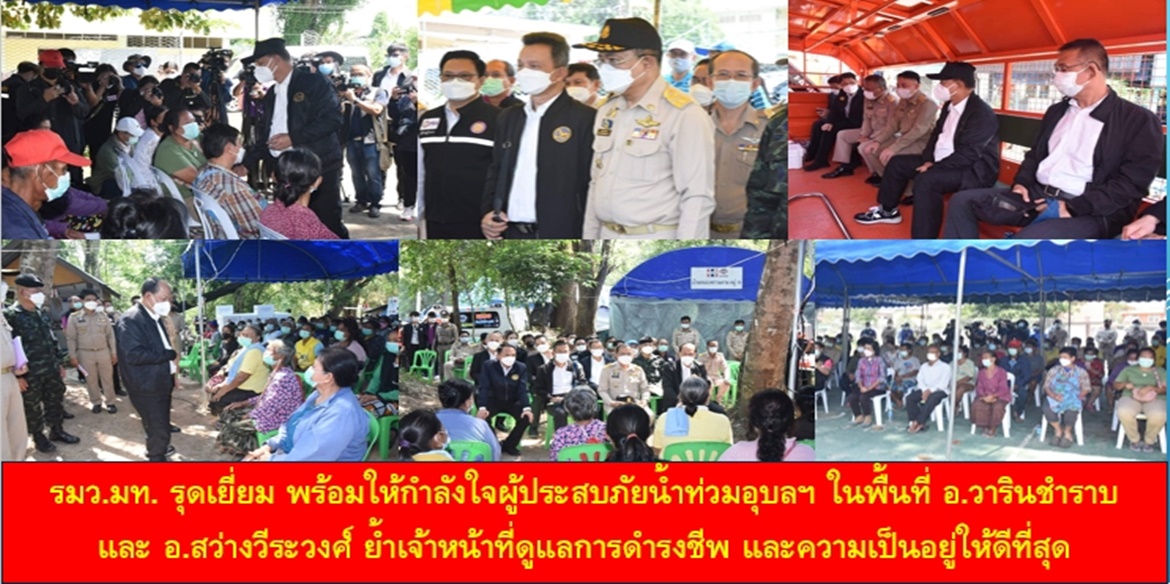 จากนั้น รัฐมนตรีว่าการกระทรวงมหาดไทย และคณะ ได้เดินทางไปตรวจเยี่ยมให้กำลังใจผู้ประสบภัยจากบ้านฮ่องอ้อ และเจ้าหน้าที่ผู้ปฏิบัติงาน โดยมีนายอำเภอสว่างวีระวงศ์ เป็นผู้กล่าวรายงาน นอกจากนี้ในช่วงบ่ายคณะเดินทางมีกำหนดการลงไปตรวจเยี่ยมให้กำลังใจผู้ประสบภัยในพื้นที่ อำเภอพิบูลมังสาหาร จังหวัดอุบลราชธานี