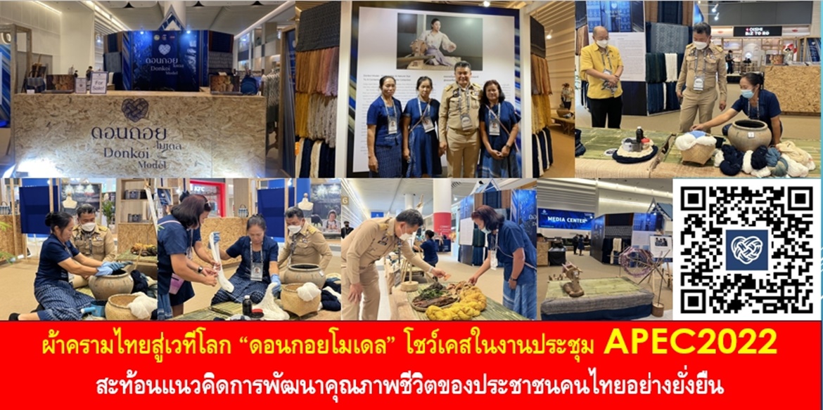““ดอนกอยโมเดล” ในวันนี้ ทำให้ปลายน้ำของวงจรชีวิตของคนที่มีความขยันหมั่นเพียรอุตสาหะ ผลิตชิ้นงานขึ้นมาได้มีโอกาสแพร่กระจายให้คนทั่วโลกได้มีโอกาสชื่นชมและสามารถเลือกซื้อสินค้าได้ เป็นการตอกย้ำถึงพระอัจฉริยภาพของพระองค์ที่ทรงสืบสานคุณค่าแห่งมรดกภูมิปัญญาวัฒนธรรมไทยไปสู่การตลาดที่สร้างมูลค่าทางเศรษฐกิจมหาศาล ยังประโยชน์ให้คุณภาพชีวิตน้องพี่น้องประชาชนดีขึ้นอย่างยั่งยืน ทั้งนี้ ภายในบูธดอนกอยโมเดล นอกจากการจัดแสดงภูมิปัญญาและฝีมือของช่างทอผ้าแล้ว ยังมีกิจกรรมแสดงและสาธิต ได้แก่ กิจกรรมย้อมสีธรรมชาติ ย้อมคราม กิจกรรมค้นฮูก กิจกรรมกวักหมี่ กิจกรรมอิ้วฝ้าย/ดีด กิจกรรมมัดหมี่ กิจกรรมคันหมี่ กิจกรรมกวัดฝ้าย กิจกรรมเข็นฝ้าย กิจกรรมทอผ้า และกิจกรรมแสดงเส้นไหมย้อมจากสีธรรมชาติ รวมทั้งมีการจำหน่ายผลิตภัณฑ์จากผ้าย้อมคราม ทั้งเสื้อผ้าเครื่องนุ่งห่ม ผ้าพันคอ กระเป๋า และสินค้าประเภทต่าง ๆ ที่ทำจากผลิตภัณฑ์ผ้าย้อมคราม ซึ่งได้รับความสนใจจากสื่อมวลชนและแขกที่เข้าร่วมการประชุมครั้งนี้เป็นจำนวนมาก และคาดว่าการออกบูธในครั้งนี้ จะสร้างรายได้เพื่อเป็นขวัญกำลังใจและคุณภาพชีวิตที่ดีให้กับพี่น้องประชาชนกลุ่มทอผ้า ทั้งยังเป็นการเผยแพร่อัตลักษณ์ภูมิปัญญาผ้าไทยที่มีความทันสมัย มีความเป็นแฟชั่นนิยมไปสู่สายตาคนทั่วทั้งโลกต่อไป” นายสุทธิพงษ์ฯ กล่าวในช่วงท้าย