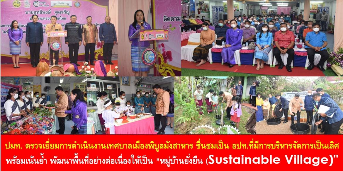 นายสุทธิพงษ์ จุลเจริญ ปลัดกระทรวงมหาดไทย เน้นย้ำว่า “เป้าหมายสูงสุดไม่ได้อยู่ที่คนทอผ้าเยอะ ๆ” แต่จะต้องทำอย่างไรให้หมู่บ้านของเราเป็น “หมู่บ้านยั่งยืน หรือ Sustainable Village ตามแนวพระดำริ” อันประกอบด้วย ประการที่ 1 หมู่บ้านต้องมีผู้คนอยู่ในศีล ในธรรม รักใคร่สามัคคี ไม่ทะเลาะเบาะแว้ง ไม่มั่วสุมอบายมุข รู้จักรักษาภูมิปัญญาผ้าไทย ตั้งแต่ต้นน้ำ กลางน้ำ ปลายน้ำ พร้อมทั้งจัดการประกวดประขันออกแบบตัดเย็บแข่งขันกันภายในอำเภอ เพื่อเกิดการแสดงฝีไม้ลายมือของลูกหลานในความสามารถด้านการออกแบบตัดเย็บเพื่อประกวด จนเกิดเกิดความมั่นใจที่จะออกแบบตัดเย็บเพื่อขาย และขยายผลสร้างเครือข่ายกลุ่มทอผ้าให้เพิ่มมากขึ้น รวมทั้ง “การจัดตั้งโรงเรียนทอผ้า” เพื่อให้พี่น้องประชาชนในพื้นที่ที่มีความต้องการศึกษาเรียนรู้เพื่อเสริมทักษะด้านการทอผ้า ให้ครอบคลุมทั้งด้าน บุคลากร (ครู) อุปกรณ์ (กี่ทอผ้า) และขั้นตอน (การทอ การออกแบบ การตัดเย็บ ฯลฯ) ก็จะทำให้เกิดความยั่งยืนในเรื่องทอผ้า ประการที่ 2 หมู่บ้านต้องมีความยั่งยืนด้านสิ่งแวดล้อม ด้วยการรณรงค์เชิญชวนให้สมาชิกในหมู่บ้านได้หันมาใส่ใจกับสิ่งแวดล้อม กับสภาวะอากาศ กับพื้นที่พื้นดินในชุมชน ในตำบล ในอำเภอ ในจังหวัด ด้วยการปลูกไม้ดอก ไม้ประดับ ไม้ให้ผล และจัดทำถังขยะเปียกลดโลกร้อนในทุกครัวเรือนของประชาชน เพื่อให้เกิดการคัดแยกขยะ และยังเป็นการลดภาวะโลกร้อนที่เป็นรูปธรรม และทำได้ง่ายภายในชุมชน โดยขอให้เทศบาลเมืองพิบูลมังสาหาร ได้ดำเนินการส่งเสริมให้ทุกครัวเรือนมีถังขยะเปียกลดโลกร้อนให้ครบถ้วน 100% ภายในวันที่ 20 ธันวาคม 2565 และประการที่ 3 หมู่บ้านต้องมีความมั่นคงด้านอาหาร ด้วยการปลูกพืชผักสวนครัวตามแนวพระราชดำริสมเด็จพระกนิษฐาธิราชเจ้า กรมสมเด็จพระเทพรัตนราชสุดาฯ สยามบรมราชกุมารี ทั้งในพื้นที่ส่วนตัวบริเวณบ้านเรือนของตนเอง ตามโครงการพระราชดำริ “บ้านนี้มีรัก ปลูกผักกินเอง” รวมถึงการส่งเสริมให้เกิดความรัก ความสามัคคีของคนในชุมชนตามโครงการ “ทางนี้มีผล ผู้คนรักกัน” โดยใช้สถานที่สาธารณะที่ไม่ส่งผลกระทบให้เกิดอันตรายต่อการสัญจร เช่น วัด โรงเรียน พื้นที่ว่างภายในชุมชน โดยเมื่อปลูกผักจำนวนมาก จนเหลือกินเหลือใช้กันทุกบ้านแล้ว ก็ยังสามารถแปรรูปกลายเป็นผลิตภัณฑ์สินค้า OTOP ที่ปลอดภัย เพิ่มพูนรายได้ จึงขอให้ท่านนายกเทศมนตรีเมืองพิบูลมังสาหารได้น้อมนำพระดำริ “หมู่บ้านยั่งยืน” มาขับเคลื่อนในพื้นที่เขตเทศบาล และย้ำเตือนท่านนายอำเภอพิบูลมังสาหาร ได้ส่งเสริมขยายไ