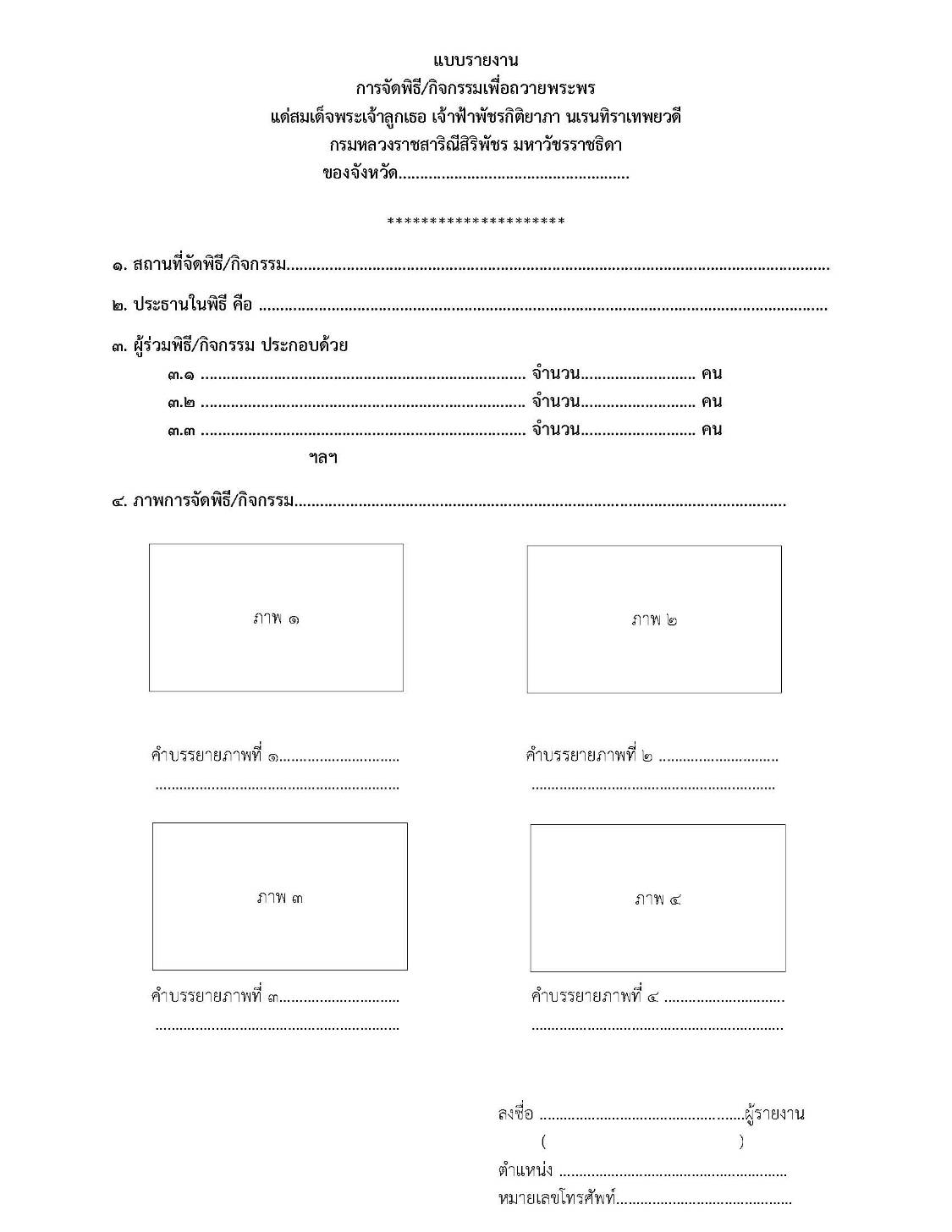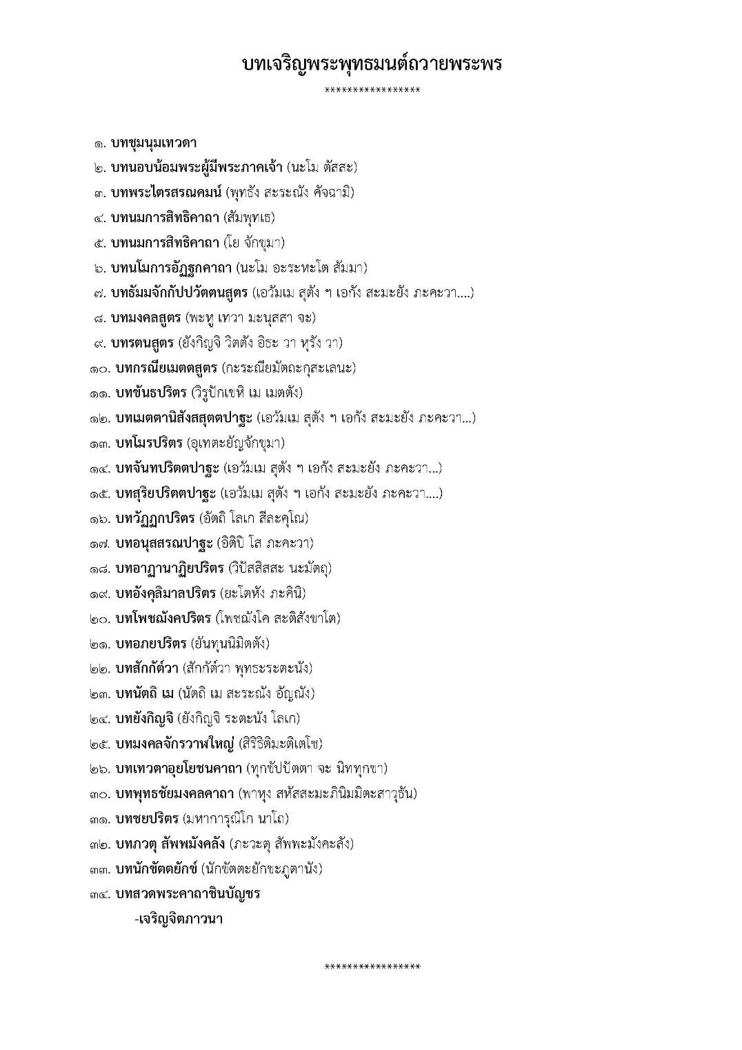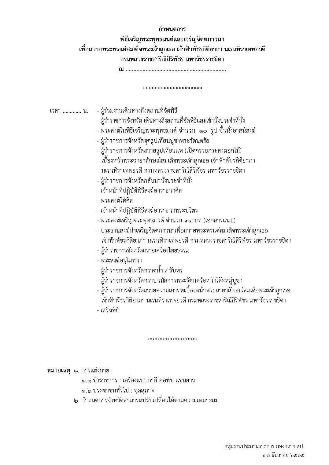 “เพื่อเป็นการรวมใจพี่น้องคนไทยทั้งชาติในการแสดงความจงรักภักดีและร่วมบำเพ็ญกุศลเพื่อถวายพระพรแด่สมเด็จพระเจ้าลูกเธอ เจ้าฟ้าพัชรกิติยาภา นเรนทิราเทพยวดี กรมหลวงราชสาริณีสิริพัชร มหาวัชรราชธิดา ให้ทรงหายจากพระอาการประชวรในเร็ววัน กระทรวงมหาดไทยได้แจ้งไปยังผู้ว่าราชการจังหวัดทุกจังหวัดร่วมกับคณะสงฆ์ และผู้นำศาสนาทุกศาสนาในพื้นที่จังหวัด จัดพิธีเจริญพระพุทธมนต์ และพิธีขอพรตามหลักของแต่ละศาสนา เพื่อถวายพระพรให้ทรงหายจากพระอาการประชวรโดยเร็ว โดยเฉพาะอย่างยิ่งในวันพฤหัสบดี ซึ่งเป็นวันคล้ายวันประสูติของสมเด็จพระเจ้าลูกเธอ เจ้าฟ้าพัชรกิติยาภา นเรนทิราเทพยวดี กรมหลวงราชสาริณีสิริพัชร มหาวัชรราชธิดา เป็นพิเศษเพิ่มเติมนอกเหนือจากประกาศของมหาเถรสมาคม เช่น การถวายภัตตาหารเพล โดยสำหรับบทเจริญพระพุทธมนต์ถวายพระพรนั้น ได้รับความกรุณาจาก เจ้าประคุณสมเด็จพระมหาวีรวงศ์ เลขานุการสมเด็จพระสังฆราช วัดราชบพิธสถิตมหาสีมาราม เมตตาประมวลรวบรวมบทสวดอันเป็นมิ่งมงคลต่าง ๆ รวม 34 บท ได้แก่ บทชุมนุมเทวดา บทนอบน้อมพระผู้มีพระภาคเจ้า (นะโม ตัสสะ) บทพระไตรสรณคมน์ (พุทธัง สะระณัง คัจฉามิ) บทนมการสิทธิคาถา (สัมพุทเธ) บทนมการสิทธิคาถา (โย จักขุมา) บทนโมการอัฏฐกคาถา (นะโม อะระหะโต สัมมา) บทธัมมจักกัปปวัตตนสูตร (เอวัมเม สุตัง ฯ เอกัง สะมะยัง ภะคะวา….) บทมงคลสูตร (พะหู เทวา มะนุสสา จะ) บทรตนสูตร (ยังกิญจิ วิตตัง อิระ วา หิรัง วา) บทกรณียเมตตสูตร (กะระณียมัตถะกุสะเลนะ) บทขันธปริตร (วิรูปักเขหิ เม เมตตัง) บทเมตตานิสังสสุตตปาฐะ (เอวัมเม สุตัง ฯ เอกัง สะมะยัง ภะคะวา..) บทโมรปริตร (อุเทตะยัญจักขุมา) บทจันทปริตตปาฐะ (เอวัมเม สตัง ฯ เอกัง สะมะยัง ภะคะวา…) บทสุริยปริตตปาฐะ (เอวัมเม สุตัง ฯ เอกัง สะมะยัง ภะคะวา..) บทวัฏฏกปริตร (วัตลิ โลเก สีละคุโถ) บทอนุสสรณปาฐะ (อิติปิ โส ภะคะวา) บทอาฏานาฏิยปริตร (วิปัสสิสสะ นะมัตถุ) บทอังคุลิมาลปริตร (ยะโตหัง ภะคินิ) บทโพชฌังคปริตร (โพชฌังโค สะติสังขาโต) บทอภยปริตร (ยันทุนนิมิตตัง) บทสักกัต์วา (สักกัตัวา พุทระระตะนัง) บทนัตถิ เม (นัตถิ เม สะระณัง อัญณัง) บทยังกิญจิ (ยังกิญจิ ระตะนัง โลเก) บทมงคลจักรวาลใหญ่ (สิริริติมะติเตโช) บทเทวตาอุยโยชนคาถา (ทุกขัปปัตตา จะ นิททุกขา) บทพุทธชัยมงคลคาถา (พาหุง สหัสสะมะภินิมมิตะสาวุธัน) บทชยปริตร (มหาการุณีโก นาโถ) บทภวตุ สัพพมังคลัง (ภะวะตุ สัพพะมังคะลัง) บทนักขัตตยักข์ (นักขัตตะยักขะภูตานัง) บทสวดพระคาถาชินบัญชร และการเจริญจิตตภาวนา นอกจากนี้ จัดพิธีปล่อยปลา ปล่อยสัตว์ โดยซื้อหาปลา หรือส