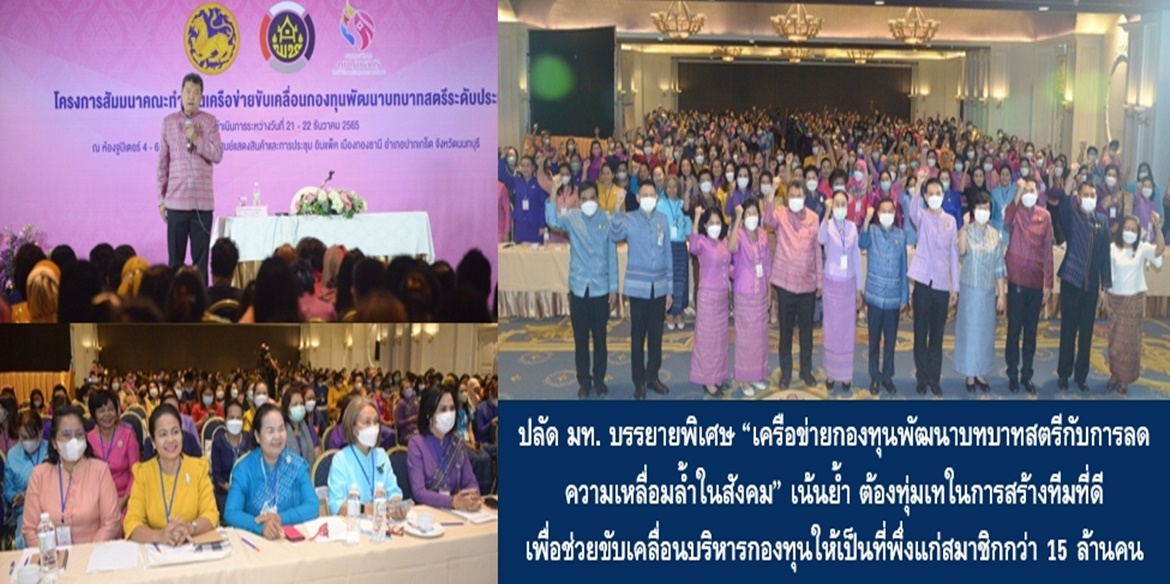 วันนี้ (22 ธ.ค. 65) เวลา 10.15 น. ที่ห้องจูปิเตอร์ 4-6 ศูนย์แสดงสินค้าและการประชุม อิมแพ็ค เมืองทองธานี อ.ปากเกร็ด จ.นนทบุรี นายสุทธิพงษ์ จุลเจริญ ปลัดกระทรวงมหาดไทย บรรยายพิเศษ เรื่อง “เครือข่ายกองทุนพัฒนาบทบาทสตรีกับการลดความเหลื่อมล้ำในสังคม” ตามโครงการสัมมนาคณะทำงานเครือข่ายขับเคลื่อนกองทุนพัฒนาบทบาทสตรีระดับประเทศ โดยมี นายอรรษิษฐ์ สัมพันธรัตน์ อธิบดีกรมการพัฒนาชุมชน นายสุรพล แก้วอินธิ ผู้ตรวจราชการกรม ปฏิบัติหน้าที่ผู้อำนวยการสำนักงานกองทุนพัฒนาบทบาทสตรี ผู้บริหารกรมการพัฒนาชุมชน พัฒนาการจังหวัด หัวหน้าคณะทำงานขับเคลื่อนกองทุนพัฒนาบทบาทสตรีทุกจังหวัดเป็นกลุ่มเป้าหมาย รวมจำนวนกว่า 500 คน ร่วมรับฟัง