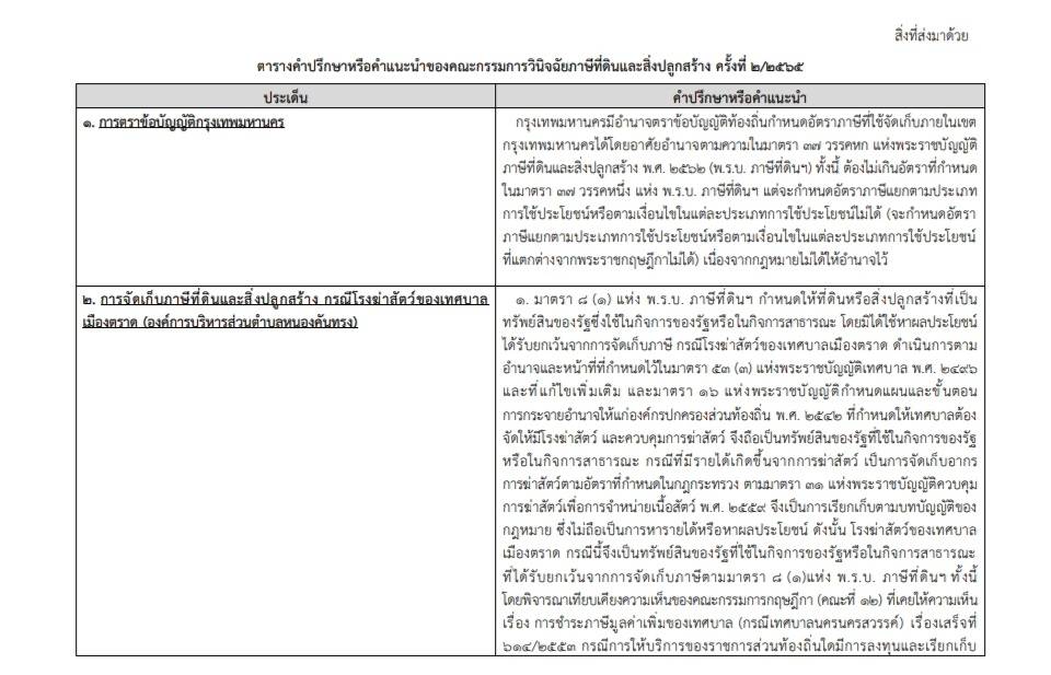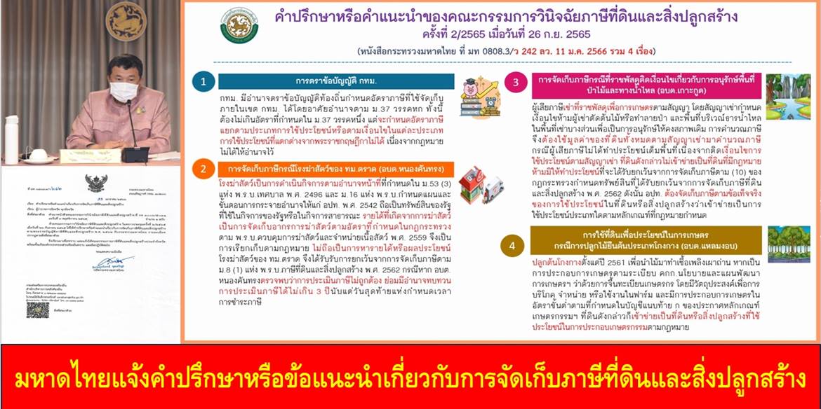 นายสุทธิพงษ์ จุลเจริญ ปลัดกระทรวงมหาดไทย กล่าวว่า เพื่อให้เกิดความชัดเจนในการดำเนินการ กระทรวงมหาดไทยจึงได้มีหนังสือแจ้งผลการตอบข้อหารือตามประเด็นดังกล่าวข้างต้นไปยังกรุงเทพมหานคร และผู้ว่าราชการจังหวัดทุกจังหวัด เพื่อแจ้งคณะกรรมการภาษีที่ดินและสิ่งปลูกสร้างประจำจังหวัด และองค์กรปกครองส่วนท้องถิ่นทุกแห่งทราบและถือปฏิบัติดังนี้