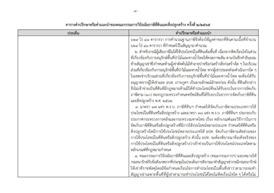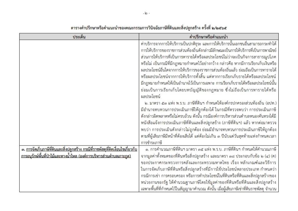 3) กรณีการจัดเก็บภาษีจากเอกชนผู้เช่าที่ราชพัสดุจากกรมธนารักษ์เพื่อทำการเกษตร ซึ่งกำหนดเงื่อนไขห้ามผู้เช่าตัดต้นไม้และดูแลรักษาพื้นที่บริเวณธารน้ำไหลในพื้นที่เช่าบางส่วน เพื่อเป็นการอนุรักษ์ให้คงสภาพเดิม ขององค์การบริหารส่วนตำบลเกาะกูด เห็นว่า การคำนวณภาษีต้องใช้มูลค่าที่ดินทั้งหมดตามสัญญาเช่ามาคำนวณภาษี ที่ดินบางส่วนซึ่งกำหนดเงื่อนไขห้ามใช้ประโยชน์ตามสัญญาเช่าดังกล่าว ไม่เข้าข่ายเป็นที่ดินที่มีกฎหมายห้ามมิให้ทำประโยชน์ตามกฎกระทรวงกำหนดทรัพย์สินที่ได้รับยกเว้นจากการจัดเก็บภาษีที่ดินและสิ่งปลูกสร้าง พ.ศ. 2562 องค์กรปกครองส่วนท้องถิ่นต้องจัดเก็บภาษีตามข้อเท็จจริงของการใช้ประโยชน์ในที่ดินหรือสิงปลูกสร้างเต็มพื้นที่ทั้งหมดตามสัญญาเช่าที่ราชพัสดุ