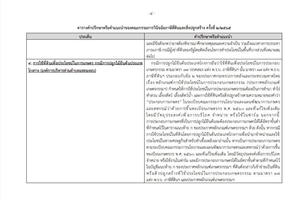 4) กรณีการจัดเก็บภาษีจากผู้เสียภาษีซึ่งปลูกไม้ยืนต้นประเกทโกงกางขององค์การบริหารส่วนตำบลแหลมงอบ เห็นว่า ผู้เสียภาษีที่ปลูกไม้ยืนต้นประเภทโกงกางเพื่อนำมาจำหน่ายและใช้ประโยชน์ทางเศรษฐกิจสำหรับทำเชื้อเพลิงเผาถ่าน หากเป็นการประกอบการเกษตรตามระเบียบคณะกรรมการนโยบายและแผนพัฒนาการเกษตรและสหกรณ์ว่าด้วยการขึ้นทะเบียนเกษตรกร พ.ศ. 2560 โดยมีวัตถุประสงค์เพื่อการบริโภค จำหน่าย หรือใช้งานในฟาร์ม และมีการประกอบการเกษตรได้ในอัตราขั้นต่ำตามที่กำหนดในบัญชีแนบท้าย ก ของประกาศกระทรวงการคลังและกระทรวงมหาดไทย เรื่อง หลักเกณฑ์การใช้ประโยชน์ในการประกอบเกษตรกรรม ที่ดินดังกล่าวก็เข้าข่ายเป็นที่ดินหรือสิ่งปลูกสร้างที่ใช้ประโยชน์ในการประกอบเกษตรกรรมตามกฎหมาย