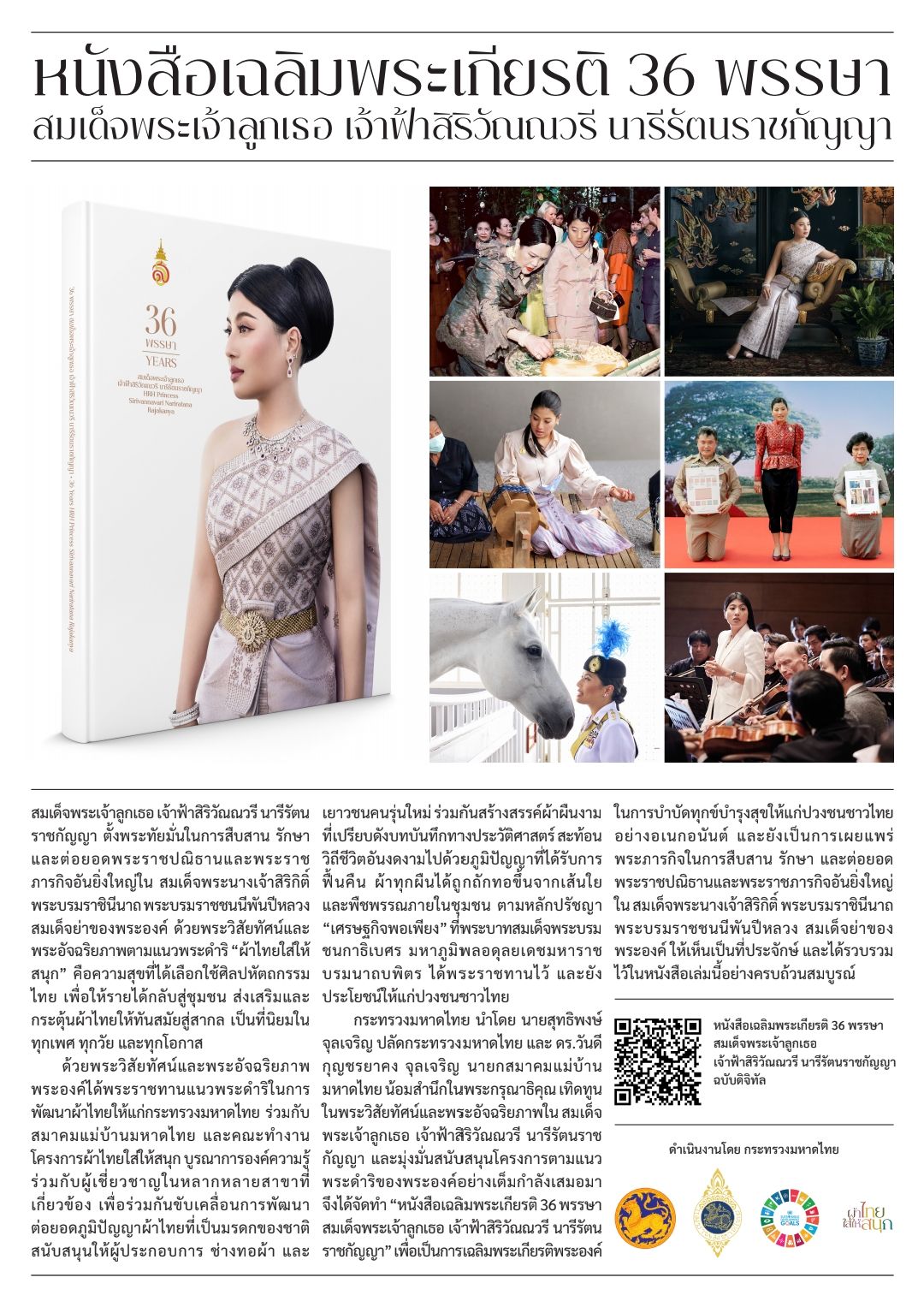ด้วยพระกรุณาธิคุณ พระอัจฉริยภาพ พระวิสัยทัศน์ที่ล้วนแล้วแต่เป็นการต่อยอดลมหายใจ ฟื้นคืนชีวิตผืนผ้าไทย และแนวพระดำริที่ทำให้เกิดการเสริมสร้างคุณภาพชีวิตที่ดีให้กับพี่น้องประชาชนคนไทย กระทรวงมหาดไทย น้อมสำนึกในพระกรุณาธิคุณอันหาที่สุดมิได้ จึงได้จัดทำหนังสือ “36 พรรษา สมเด็จพระเจ้าลูกเธอ เจ้าฟ้าสิริวัณณวรี นารีรัตนราชกัญญา” เพื่อเฉลิมพระกียรติพระองค์ท่าน ซึ่งหนังสือเล่มนี้เป็นหนังสือที่มีคุณค่าอย่างยิ่ง เพราะได้รับพระอนุญาตและเป็นคอลเลคชั่นภาพพิเศษของพระองค์ และอันเป็นการถวายพระกำลังใจให้พระองค์ผู้ทรงตรากตรำทรงงานหนักให้พสกนิกรชาวไทยและทรงเป็นผู้นำพระราชทานแนวพระดำริขับเคลื่อนโครงการต่าง ๆ ซึ่งจะได้ขยายผลเผยแผ่สายธารแห่งพระบารมีผ่านหนังสือฉบับนี้ส่งผ่านท่านเอกอัครราชทูตไทยในต่างประเทศ และสื่อมวลชน รวมถึงห้องสมุดทั่วประเทศ เพื่อจะได้ชื่นชมพระบารมีและพระอัจริยภาพของสมเด็จพระเจ้าลูกเธอ เจ้าฟ้าสิริวัณณวรี นารีรัตนราชกัญญา ท้ายสุดนี้ ขอให้พระองค์ทรงพระเจริญ ทรงมีพระชนมายุยิ่งยืนนาน เป็นมิ่งขวัญสถิตในดวงใจอยู่คู่กับเราคนไทยบนผืนแผ่นดินธรรม แผ่นดินทองนี้ตลอดกาลนาน
