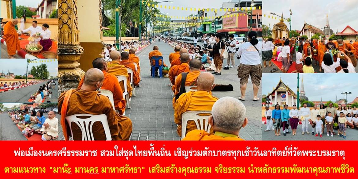 นายอภินันท์ เผือกผ่อง กล่าวต่ออีกว่า นอกจากนี้ กิจกรรมดังกล่าว เพื่อเสริมสร้างคุณธรรม จริยธรรม พัฒนาคุณภาพชีวิต นำหลักคำสอนขององค์พระสัมมาสัมพุทธเจ้าไปปรับใช้ในการทำงานเพิ่มความเป็นสิริมงคลกับให้กับพี่น้องประชาชน ตลอดจนทุกส่วนราชการในจังหวัดนครศรีธรรมราช อีกทั้งร่วมเป็นเป็นส่วนหนึ่งในการส่งเสริมวัดพระมหาธาตุสู่มรดกโลกด้วย อีกทั้งยังสามารถนำมาส่งเสริมการท่องเที่ยวของจังหวัดได้ ประกอบกับจังหวัดนครศรีธรรมราชได้ยึดหลักการ partnership ตามเป้าหมายการพัฒนาที่ยั่งยืน (SDGs) ข้อที่ 17 โดยมีคณะสงฆ์เป็นภาคีเครือข่ายสำคัญ ตามหลัก “บวร” ด้วยความร่วมมือร่วมใจของทุกภาคีเครือข่าย ในอนาคต จังหวัดนครศรีธรรมราชจะเป็นเมืองที่มีภาพลักษณ์ในด้านการท่องเที่ยวทางวัฒนธรรมเฉกเช่นเดียวกับ เมืองหลวงพระบาง สปป.ลาว เมืองมรดกโลก ที่ผู้คนต่างสวมใส่ชุดพื้นเมือง มาทำบุญตักบาตร ด้วยอากัปกิริยาที่สำรวม ด้วยจิตใจที่สงบ ทำบุญตักบาตรด้วยความเคารพนบนอบ ประพฤติปฏิบัติตนเหมาะสมกับความเป็นชาวพุทธ เพื่อดำรงไว้ซึ่งพระพุทธศาสนาให้คงอยู่คู่กับผืนแผ่นดิน และคู่กับโลกใบนี้ตลอดไป