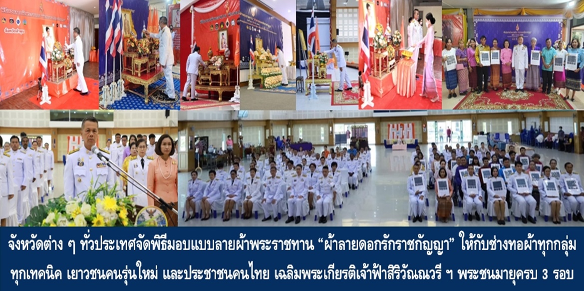 1. จังหวัดลำพูน ที่หอประชุมที่ว่าการอำเภอเมืองลำพูน นายสันติธร ยิ้มละมัย ผู้ว่าราชการจังหวัดลำพูน เป็นประธานในพิธีมอบลายผ้าพระราชทาน “ผ้าลายดอกรักราชกัญญา” ให้กับหัวหน้าส่วนราชการ นายอำเภอ กลุ่มทอผ้า และผู้ผลิตผ้าทุกกลุ่ม โดยมีนายชาตรี กิตติธนดิตถ์ รองผู้ว่าราชการจังหวัดลำพูน พร้อมด้วยหัวหน้าส่วนราชการ นางบำเพ็ญ เมืองมูล พัฒนาการจังหวัดลำพูน นายอำเภอทุกอำเภอ ช่างทอผ้า กลุ่มทอผ้า ผู้ผลิตผ้าทุกกลุ่ม และเจ้าหน้าที่หน่วยงานที่เกี่ยวข้อง เข้าร่วมพิธี