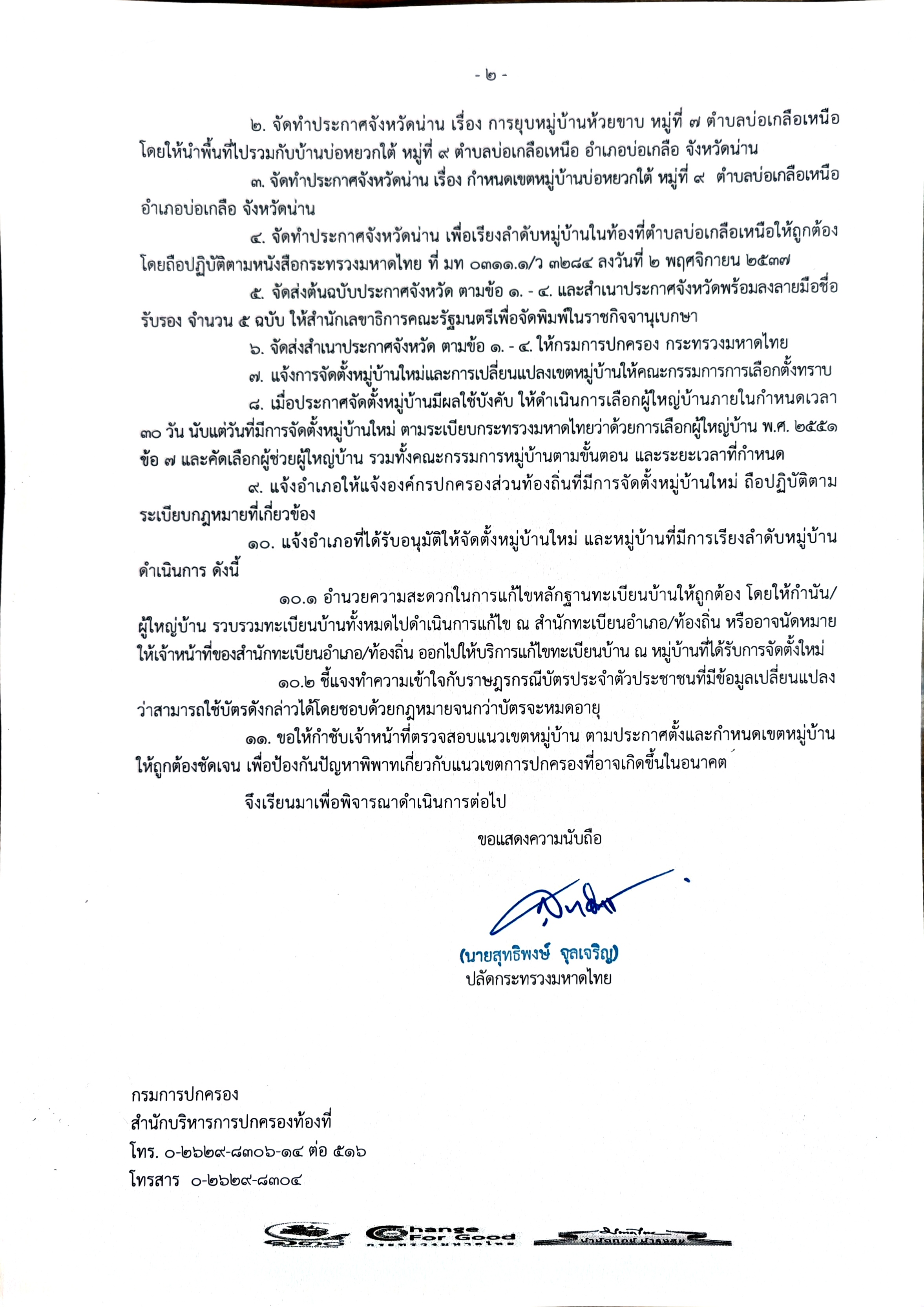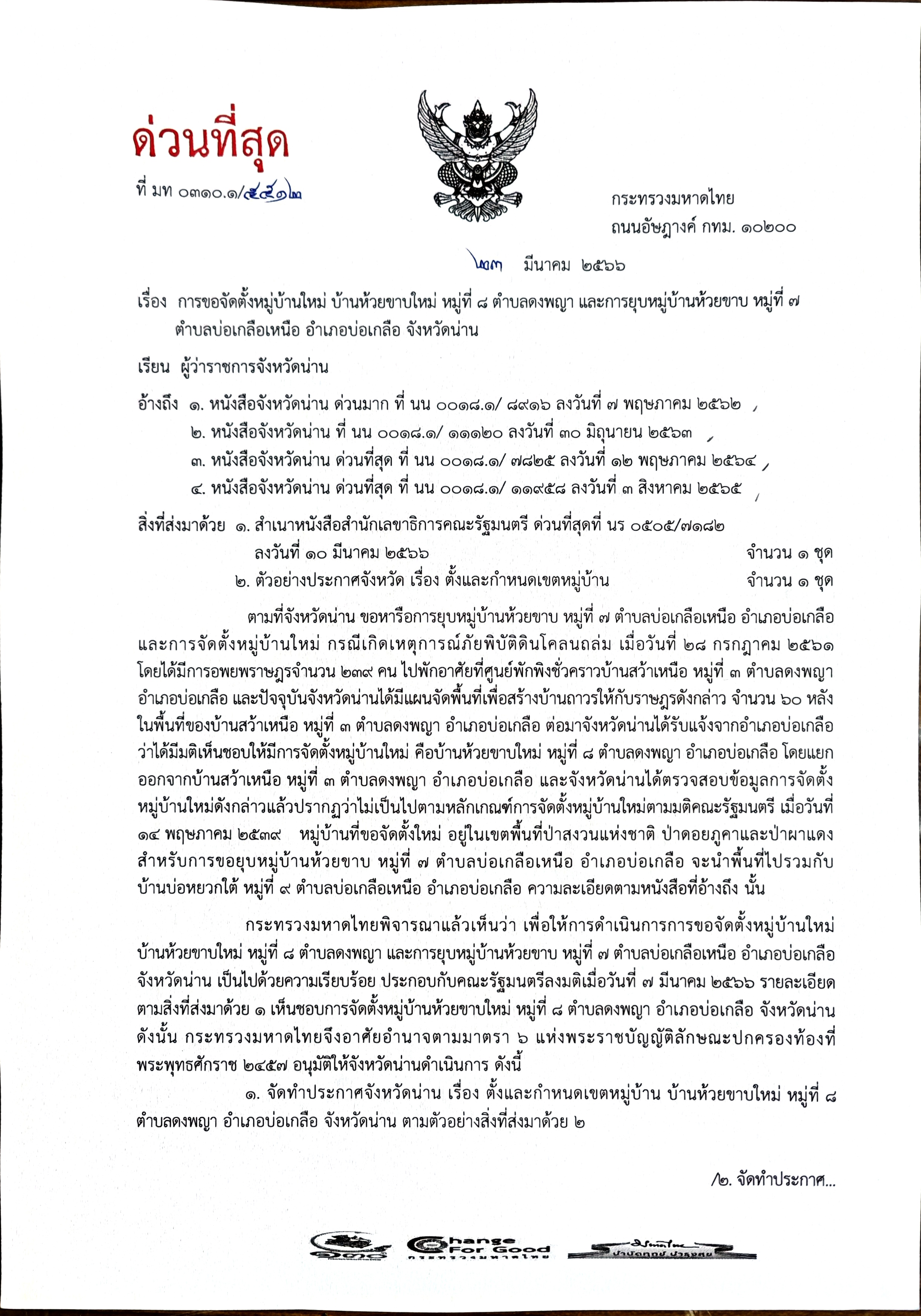ปลัดกระทรวงมหาดไทย กล่าวว่า พล.อ.อนุพงษ์ เผ่าจินดา รัฐมนตรีว่าการกระทรวงมหาดไทย โดยความเห็นชอบของพล.อ.ประวิตร วงษ์สุวรรณ รองนายกรัฐมนตรีที่กำกับการบริหารราชการกระทรวงมหาดไทย ได้เสนอความคิดเห็นต่อคณะรัฐมนตรีเกี่ยวกับเรื่อง การขอจัดตั้งหมู่บ้านใหม่คือ บ้านห้วยขาบใหม่ หมู่ที่ 8 ตำบลดงพญา อำเภอบ่อเกลือ โดยขอยกเว้นหลักเกณฑ์การจัดตั้งหมู่บ้านใหม่ตามมติคณะรัฐมนตรี เมื่อวันที่ 14 พฤษภาคม 2539 ซึ่งคณะรัฐมนตรีได้มีมติเห็นชอบในการประชุมหารือเมื่อวันที่ 7 มีนาคม 2566 โดยมี พล.อ.ประยุทธ์ จันทร์โอชา นายกรัฐมนตรี เป็นประธาน ให้จัดตั้ง “บ้านห้วยขาบใหม่ หมู่ที่ 8 ตำบลดงพญา อำเภอบ่อเกลือ” ตามที่กระทรวงมหาดไทยเสนอ สำหรับหมู่บ้านห้วยขาบ หมู่ที่ 7 (บ้านห้วยขาบเดิม) จะนำพื้นที่ไปรวมกับบ้านบ่อหยวกใต้ หมู่ที่ 9 ตำบลบ่อเกลือเหนือ อำเภอบ่อเกลือ จังหวัดน่านแทน