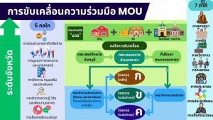 นายสุทธิพงษ์ จุลเจริญ กล่าวเพิ่มเติมว่า กระทรวงมหาดไทยเป็นกระทรวงที่มีภารกิจหลักในการบำบัดทุกข์ บำรุงสุข ทำงานร่วมกับภาคีเครือข่ายในพื้นที่ เป็นผู้นำการบูรณาการข้าราชการ พนักงาน เจ้าหน้าที่ของทุกกระทรวง ทุกกรมในพื้นที่จังหวัด ซึ่งในการบูรณาการดังกล่าวมี “คณะสงฆ์” เป็นภาคีเครือข่ายผู้นำศาสนาที่มีความสำคัญต่อการหนุนเสริมบทบาทของคนมหาดไทย จึงเป็นที่มาของการลงนามบันทึกข้อตกลงความร่วมมือบทบาทในการเกื้อหนุนระหว่างวัดและชุมชนให้มีความสุขอย่างยั่งยืนกับเจ้าประคุณสมเด็จพระมหาธีราจารย์ กรรมการมหาเถรสมาคม ประธานกรรมการฝ่ายสาธารณสงเคราะห์ของมหาเถรสมาคม และสถาบันเทคโนโลยีพระจอมเกล้าเจ้าคุณทหารลาดกระบัง และบันทึกข้อตกลงความร่วมมือโครงการวัด ประชา รัฐ สร้างสุขกับเจ้าประคุณสมเด็จพระมหาวีรวงศ์ กรรมการมหาเถรสมาคม ประธานกรรมการฝ่ายสาธารณูปการของมหาเถรสมาคม โดยมีจุดมุ่งหมายสำคัญ เพื่อให้พระสงฆ์ได้ช่วยกระตุ้นปลุกเร้าข้าราชการได้ลงไปร่วมคิด ร่วมคุย ร่วมปรึกษาหารือ ร่วมทำ ร่วมพัฒนา ร่วมทำกิจกรรมงานใดใดในพื้นที่ให้กับพี่น้องประชาชน และทำให้ได้รับประโยชน์จากการสงเคราะห์ อันได้แก่ 1) เชิงนามธรรม คือ ญาติโยมทุกครัวเรือนจะมีจิตใจอ่อนโยนโน้มหาพระคุณเจ้า เข้าหาพระศาสนาเพิ่มมากขึ้น ทั้งยังส่งเสริมให้ประชาชนได้ยึดมั่นในประเพณีวัฒนธรรมปฏิบัติตนอยู่ในศีลในธรรม ส่งต่อรุ่นสู่รุ่นทำให้ลูกหลานมีความคุ้นชินกับศาสนกิจต่าง ๆ มีจิตใจโน้มหาความดี ด้วยหลักธรรมทางพระพุทธศาสนา และ 2) เชิงรูปธรรม สามารถจำแนกได้ 2 ลักษณะ คือ ลักษณะที่ 1 มิติยาฝรั่ง ด้วยการสงเคราะห์ช่วยเหลือบำรุงจิตใจผู้สูงอายุ ผู้ป่วยติดเตียง คนที่ยากไร้ไม่สามารถช่วยเหลือตนเองได้ ให้ประทังชีวิตบรรเทาความทุกข์ในระดับหนึ่ง และลักษณะที่ 2 คือ มิติยาไทย เป็นการดำเนินการไปสู่ความยั่งยืน โดยพระสงฆ์เป็นผู้นำข้าราชการลงไปในพื้นที่ ไปกระตุ้นปลุกเร้าให้ลุกขึ้นมาน้อมนำหลักปรัชญาของเศรษฐกิจพอเพียงและพระราชดำริต่าง ๆ เพื่อทำให้เขามีคุณภาพชีวิตที่ดีอย่างยั่งยืน โดยไม่รีรอให้คนช่วยอย่างเดียว ทำให้คนเป็นบัวพ้นน้ำ เป็นผู้รู้ ผู้ตื่น ผู้เบิกบาน ช่วยกันดูแลครอบครัว ขยายผลไปดูแลชุมชน ตำบล อำเภอ จังหวัด ได้แก่ 1) ทุกครอบครัวมีที่อยู่อาศัยที่มั่นคง แข็งแรง ถูกสุขลักษณะ 2) ทุกครัวเรือนสามารถพึ่งพาตนเอง น้อมนำพระราชดำริของสมเด็จพระกนิษฐาธิราชเจ้า กรมสมเด็จพระเทพรัตนราชสุดา ฯ สยามบรมราชกุมารี ในด้านการสร้างความมั่นคงด้านอาหาร “บ้านนี้