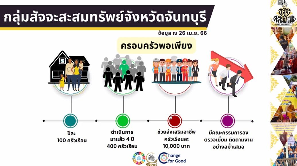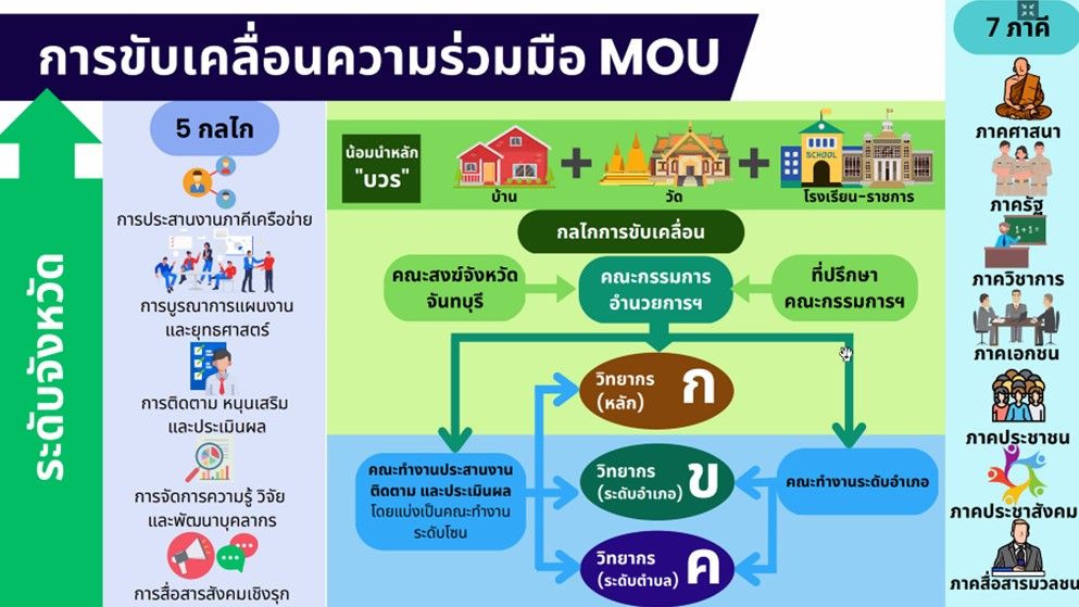 “เฉกเช่นที่จังหวัดจันทบุรี มีคณะสงฆ์ภายใต้การนำของพระเดชพระคุณท่านเจ้าคุณพระราชธรรมเมธี เจ้าคณะจังหวัดจันทบุรี เป็นต้นแบบในการทำให้พี่น้องคนจันทบุรีได้มีแนวทางการดำเนินชีวิตที่ดีอย่างยั่งยืนผ่านความสำเร็จของ “กลุ่มสัจจะสะสมทรัพย์” อันเป็นแนวทางว่า พระสามารถทำให้โยมเป็นคนดี คือ มีสัจจะ รู้จักการบริหารชีวิต ทำงาน หารายได้ จัดสรรรายได้ที่ได้สำหรับสะสมหรือออมทรัพย์ไว้บางส่วน และหาแนวทางในการที่จะทำให้เงินที่สะสมนั้นไปเป็นต้นทุนสำหรับเอาไปใช้ในการลงทุน อันเป็น “ความเมตตาของพระ” ที่เกิดจากการพูดคุยให้สมาชิกกลุ่มสัจจะสะสมทรัพย์มีแนวทางการดำเนินชีวิตที่ดี ที่ถูกต้อง และมีระบบระเบียบในการบริหารจัดการกลุ่มที่โปร่งใสและเป็นธรรม ซึ่งสิ่งสำคัญที่จะทำให้ต้นแบบความสำเร็จนี้เกิดความยั่งยืน คือ การขยายผลความสำเร็จไปสู่การขับเคลื่อนงานสาธารณสงเคราะห์ ลงพื้นที่ไปเยี่ยมเยียน ทำให้วัดเป็นศูนย์กลางการน้อมนำเอาหลักปรัชญาของเศรษฐกิจพอเพียงและทฤษฎีใหม่มาดำเนินการให้เข้ากับหลักภูมิสังคมของแต่ละพื้นที่ ด้วย “ทีมอำเภอบำบัดทุกข์ บำรุงสุขแบบบูรณาการอย่างยั่งยืน” ที่มีนายอำเภอทุกอำเภอเป็นผู้นำในการบูรณาการระดับอำเภอ และปลัดอำเภอเป็นผู้นำการบูรณาการระดับตำบล ด้วยแนวทาง 3 ประการ คือ 1. ต้องมี “ทีมพระ” ลุกขึ้นมายืนเคียงข้าง “1 พระสังฆาธิการ 1 ภาคราชการประจำตำบล ทุกตำบล” และให้ทุกอำเภอจัดทำบัญชีรายชื่อพระสงฆ์พร้อมข้อมูลเพื่อจัดทำฐานข้อมูลภาคีเครือข่าย 2. ต้องมีการ “พูดคุย-วางแผน” ร่วมกันของพระสงฆ์ ข้าราชการ และภาคีเครือข่ายอย่างสม่ำเสมอ และ 3. ต้องลงพื้นที่จริงร่วมกันอย่างน้อย 1 พื้นที่/เดือน เพื่อทำให้มีบรรยากาศของการที่ชาวบ้านได้ร่วมกันพบปะ พูดคุย ปรึกษาหารือ ร่วมคิด ร่วมทำ ร่วมรับประโยชน์เกิดขึ้นเต็มผืนแผ่นดินไทย สอดคล้องกับสิ่งที่ท่านผู้ว่าราชการจังหวัดทุกจังหวัดที่ได้ลงนาม MOU ร่วมกับ UN ประจำประเทศไทย ประกาศเจตนารมณ์เพื่อประเทศไทยที่ยั่งยืน (Statement of Commitment to Sustainable Thailand) “76จังหวัด 76 คำมั่นสัญญา” เพื่อแสดงความมุ่งมั่นทำให้เกิดการพัฒนาที่ยั่งยืนตามเป้าหมายการพัฒนาที่ยั่งยืน (UN SDGs) ทั้ง 17 ข้อ โดยเฉพาะข้อที่ 17 การเป็นหุ้นส่วน Partnership มีความช่วยเหลือร่วมมือกันโดยมีพระสงฆ์เป็นหลักชัย อันจะทำให้สังคมไทยเป็นสังคมที่ดีงาม ผู้คนมีความสุขทั้งกาย และใจ มีความปลอดภัย มั่นคงทางร่างกายและจิตใจ เป็นสังคมแห่งการให้ เป็นสังคมแห่งความรัก ความเมตตา เพราะมีคณะสงฆ์เป็นที่พึ่งหลัก มีผู้บริหารระดับสูงของกระท