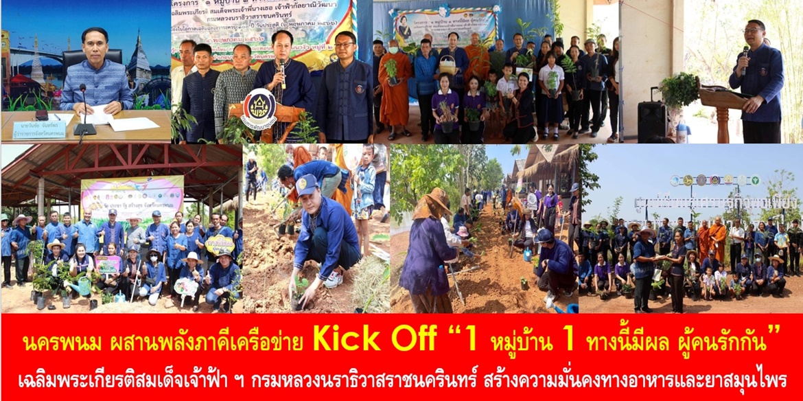 “กิจกรรม “1 หมู่บ้าน 1 ทางนี้มีผล ผู้คนรักกัน เฉลิมพระเกียรติสมเด็จพระเจ้าพี่นางเธอ เจ้าฟ้ากัลยาณิวัฒนา กรมหลวงนราธิวาสราชนครินทร์” ในครั้งนี้ ประกอบด้วย การมอบต้นกล้าผักสวนครัวและไม้ผล รวมถึงการปลูกพืชสมุนไพร ที่สามารถเป็นได้ทั้งอาหารและยา และกิจกรรมปลูกไม้ผลสองข้างทาง ระยะทางประมาณ 100 เมตร ซึ่งพันธุ์ทั้งหมดได้รับการสนับสนุนจากองค์กรภาคีเครือข่ายทุกภาคส่วน ที่ร่วมกันนำเมล็ดพันธุ์พืชผักสวนครัวมาร่วมกันในวันนี้ เช่น การปลูกผักสวนครัว กว่า 10 ชนิด กล้วยน้ำว้า ข่า น้ำเต้า ฟักทอง กระชาย ฟ้าทะลายโจร แมงลัก ตะไคร้ ต้นหอม ต้นแค ต้นลิ้นจี่ ต้นพันธุ์ผักหวานป่า มะละกอ พริก และมะเขือ เป็นต้น นอกจากนี้ยังมีกิจกรรมการรณรงค์การใช้ถังขยะเปียกลดโลกร้อน มีการสาธิตคัดแยกขยะต้นทางเศษอาหารหรือขยะเปียกออกจากขยะทั่วไป เพื่อสร้างการรับรู้และความเข้าใจให้คนในพื้นที่ได้ตระหนักและมีส่วนร่วมในการลดปริมาณขยะในชุมชน/ครัวเรือน นำไปสู่การเป็นครัวเรือนที่ถูกสุขลักษณะ มีความเป็นระเบียบเรียบร้อย ชุมชนสะอาด และสามารถลดภาวะโลกร้อนให้กับโลกใบนี้ของเราด้วย” นายวันชัย จันทร์พร ผู้ว่าราชการจังหวัดนครพนม กล่าว