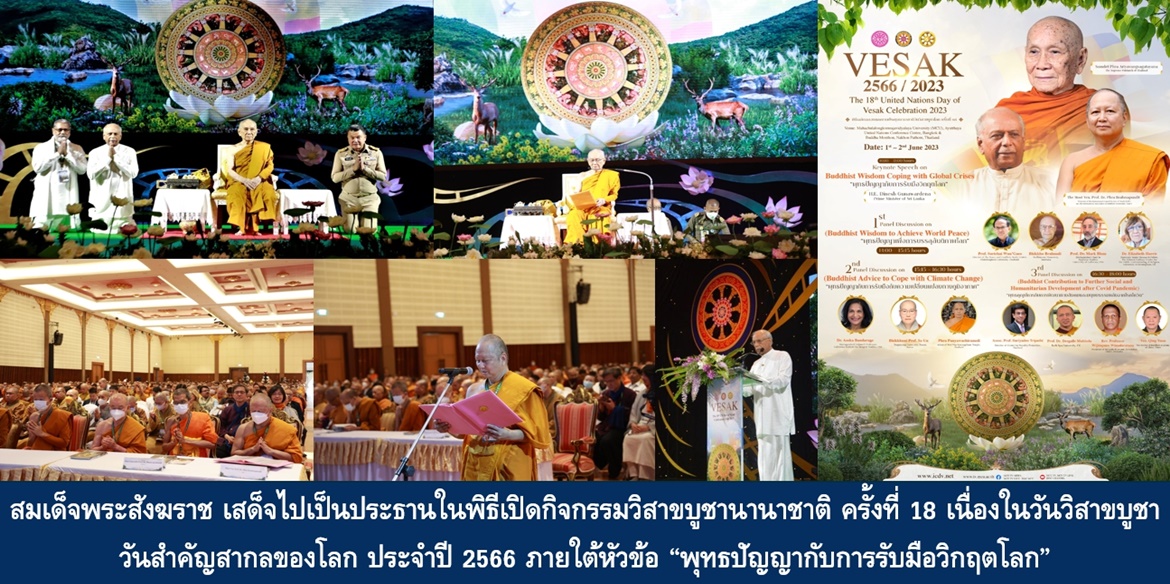 วันนี้ (1 มิ.ย. 66) เวลา 09.00 น. ที่ อาคารหอประชุม มวก.48 พรรษา มหาวิทยาลัยมหาจุฬาลงกรณราชวิทยาลัย อ.วังน้อย จ.พระนครศรีอยุธยา เจ้าพระคุณสมเด็จพระอริยวงศาคตญาณ สมเด็จพระสังฆราช สกลมหาสังฆปริณายก เสด็จไปเป็นประธานในพิธีเปิดกิจกรรมวิสาขบูชานานาชาติ ครั้งที่ 18 เนื่องในวันวิสาขบูชา วันสำคัญสากลของโลก ประจำปี 2566 ภายใต้หัวข้อ “พุทธปัญญากับการรับมือวิกฤตโลก” โดยมี พระพรหมบัณฑิต กรรมการมหาเถรสมาคม อุปนายกสภามหาวิทยาลัยมหาจุฬาลงกรณราชวิทยาลัย ประธานสภาสากลวันวิสาขบูชาโลก และประธานสมาคมมหาวิทยาลัยพระพุทธศาสนานานาชาติ พระเถรานุเถระ นายสุทธิพงษ์ จุลเจริญ ปลัดกระทรวงมหาดไทย นายนิวัฒน์ รุ่งสาคร ผู้ว่าราชการจังหวัดพระนครศรีอยุธยา นางสมทรง พันธ์เจริญวรกุล นายกองค์การบริหารส่วนจังหวัดพระนครศรีอยุธยา หัวหน้าส่วนราชการ และพุทธศาสนิกชนจากทั่วโลก ร่วมพิธี โดยได้รับเกียรติจาก นายดิเนช คุณวาระเดนะ (H.E. Dinesh Gunawardena) นายกรัฐมนตรีศรีลังกา ปาฐกถาพิเศษ เรื่อง “พุทธปัญญากับการรับมือวิกฤตโลก” ในครั้งนี้ด้วย