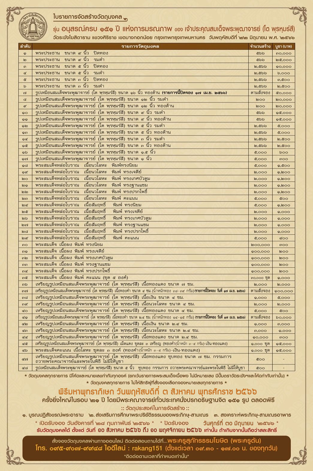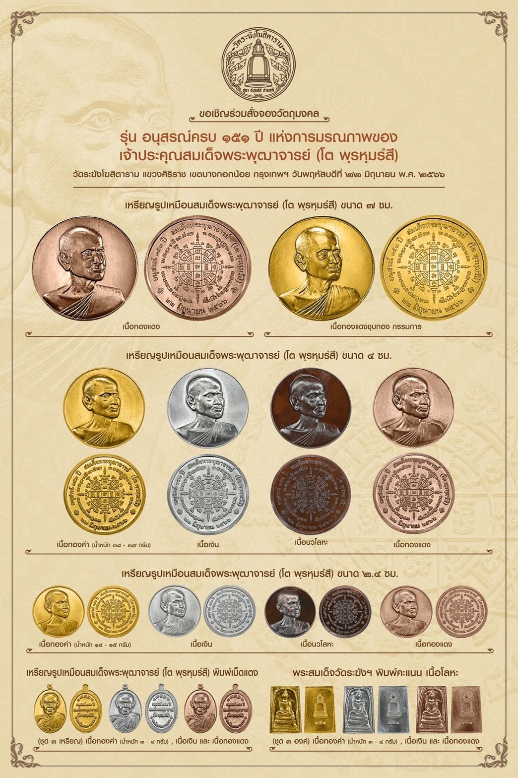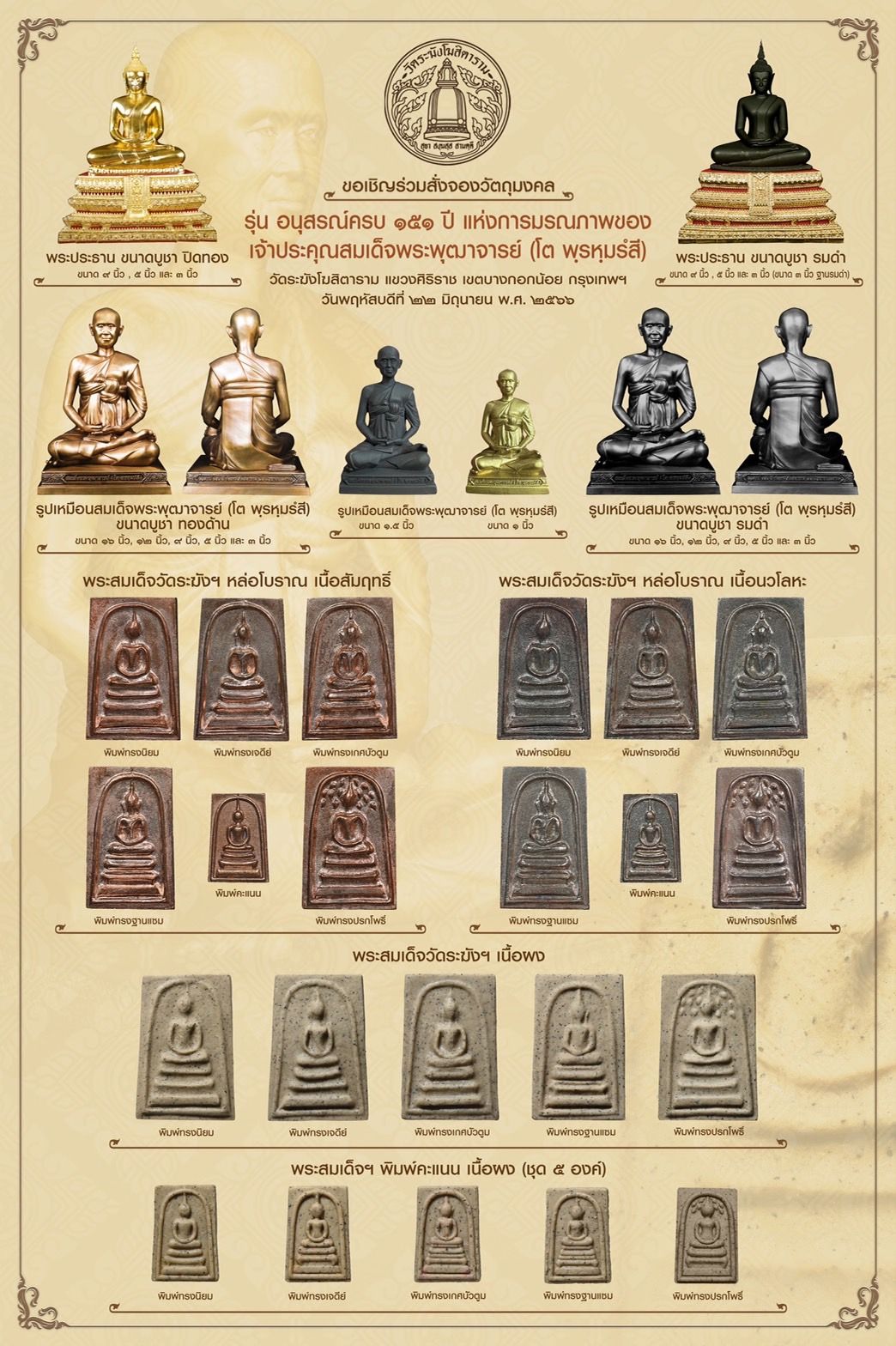 “การจัดสร้างวัตถุมงคลรุ่น อนุสรณ์ 151 ปี มรณกาล เจ้าประคุณสมเด็จพระพุฒาจารย์ (โต พฺรหฺมรํสี) มีรายการจัดสร้าง ได้แก่ 1) พระประธานยิ้มรับฟ้าองค์จำลอง 2) รูปเหมือนเจ้าประคุณสมเด็จพระพุฒาจารย์ (โต พฺรหฺมรํสี) 3) พระสมเด็จหล่อโบราณ และ 4) พระสมเด็จเนื้อผง โดยได้รับเมตตาจากเจ้าพระคุณสมเด็จพระอริยวงศาคตญาณ สมเด็จพระสังฆราช สกลมหาสังฆปริณายก เสด็จเป็นองค์ประธานพิธีเททองหล่อนำฤกษ์ เมื่อวันที่ 17 เมษายน 2566 และมีพระมหาเถระ พระเถระ ได้แก่ เจ้าประคุณสมเด็จพระธีรญาณมุนี วัดเทพศิรินทราวาส เจ้าประคุณสมเด็จพระพุฒาจารย์ วัดไตรมิตรวิทยาราม เจ้าประคุณสมเด็จพระมหาวีรวงศ์ วัดราชบพิธสถิตมหาสีมาราม เจ้าประคุณสมเด็จพระพุทธพจนวชิรมุนี วัดเครือวัลย์ วรวิหาร อธิษฐานจิต พระราชพัฒนากร วัดปริวาสราชสงคราม พระราชพัฒนสุนทร วัดทรงธรรม วรวิหาร พระมงคลวโรปการ วัดชินวราราม วรวิหาร พระครูธรรมธรดิเรก อนุตฺตโร วัดหนองทราย นั่งปรกประจำทิศ” พระครูสุภัทรธรรมโฆษิต กล่าว