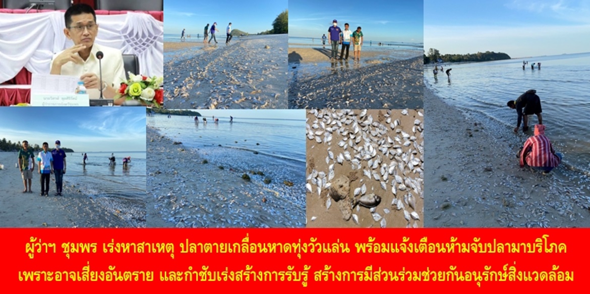 นายวิสาห์ พูลศิริรัตน์ ผู้ว่าราชการจังหวัดชุมพร กล่าวเพิ่มเติมอีกว่า หลังจากเกิดเหตุ ตนได้สั่งการให้ ฝ่ายปกครองอำเภอ ประมงอำเภอ องค์กรปกครองส่วนท้องถิ่น กำนัน ผู้ใหญ่บ้าน และหน่วยงานที่เกี่ยวข้อง เร่งจัดเก็บปลาที่ตาย บริเวณหาดทุ่งวัวแล่นและนำไปกำจัดอย่างถูกวิธี เพื่อป้องกันปัญหาน้ำเน่าเสียและส่งกลิ่นเหม็น ที่จะส่งผลกระทบต่อสิ่งแวดล้อม ทำให้เกิดความสูญเสียทางเศรษฐกิจ พร้อมให้หน่วยงานที่เกี่ยวข้องกับสิ่งแวดล้อมทางทะเล เร่งดำเนินการตรวจสอบหาสาเหตุ ประเมินความรุนแรงของเหตุการณ์ และประเมินความสูญเสียของสัตว์น้ำ “ขอเน้นย้ำให้พี่น้องประชาชนที่มาเก็บปลา อย่าเพิ่งนำไปบริโภค ซึ่งเสี่ยงเกิดอันตราย เพราะยังไม่ทราบว่าเป็นแพลงก์ตอนบลูมชนิดใด อาจจะเป็นอันตรายกับผู้บริโภค ซึ่งจังหวัดชุมพร ได้ประสานให้ศูนย์วิจัยประมงชายฝั่ง มาเก็บตัวอย่างน้ำและปลาไปตรวจสอบแล้ว ซึ่งต้องรอผลตรวจว่าเป็นแพลงก์ตอนชนิดที่กินได้หรือไม่ แต่หากนำไปทำปุ๋ยหมักสามารถทำได้ และเป็นประโยชน์ด้วย ทั้งนี้ ได้กำชับให้ทุกหน่วยงานเร่งประชาสัมพันธ์สร้างการรับรู้ผ่านทุกช่องทางสื่อสาร พร้อมทั้ง สร้างความตระหนักในการอนุรักษ์สิ่งแวดล้อมและทรัพยากรธรรมชาติให้พี่น้องประชาชนมีส่วนร่วมลดสภาวะโลกร้อน ดังที่กระทรวงมหาดไทยได้ขับเคลื่อนเป้าหมายการพัฒนาที่ยั่งยืน (UN SDGs) ร่วมกับองค์การสหประชาชาติ เพื่อให้ทุกคนได้อยู่คู่กับโลกใบนี้ มีโลกที่สดใสตลอดไปอย่างยั่งยืน“