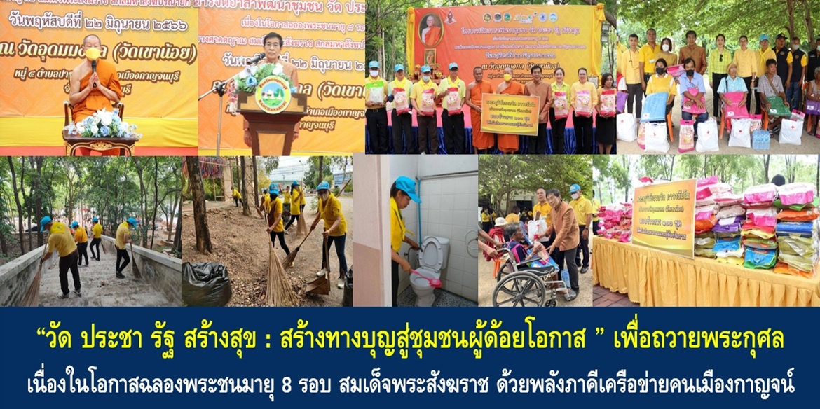 “จังหวัดกาญจนบุรีได้จัดโครงการจิตอาสาพัฒนาชุมชน วัด ประชา รัฐ สร้างสุข เนื่องในโอกาสฉลองพระชนมายุ 8 รอบ สมเด็จพระอริยวงศาคตญาณ สมเด็จพระสังฆราช สกลมหาสังฆปริณายก 26 มิถุนายน 2566 โดยได้รับเมตตาจาก พระเทพปริยัติโสภณ เจ้าคณะจังหวัดกาญจนบุรี เป็นประธานฝ่ายสงฆ์ โดยมีพระครูวินัยธรถวิล ถาวรธมฺโม เจ้าอาวาสวัดอุดมมงคล (เขาน้อย) เมตตาร่วมพิธี และมี นางสาวกิตติยา จึงรุ่งเจริญกิจ รองนายกเหล่ากาชาดจังหวัดกาญจนบุรี นางรัชนี โพธิสัตยา พัฒนาการจังหวัดกาญจนบุรี นายอุทัย ขันทอง หัวหน้าสำนักงานป้องกันและบรรเทาสาธารณภัยจังหวัดกาญจนบุรี นายธนณัฏฐ์ ศรีสันต์ นายอำเภอเมืองกาญจนบุรี นายสุวัตร ตระกูลชมดง รองนายกเทศมนตรีเมืองปากแพรก ผู้แทนหัวหน้าส่วนราชการ ข้าราชการ จิตอาสากองพลทหารราบที่ 9 กรมทหารราบที่ 29 ผู้บริหารองค์กรปกครองส่วนท้องถิ่น ผู้นำชุมชน องค์กรภาคีเครือข่าย ผู้แทนครัวเรือนกลุ่มเป้าหมายแก้ไขปัญหาความยากจน รวมกว่า 300 คน ร่วมพิธี” ผู้ว่าราชการจังหวัดกาญจนบุรี กล่าวเพิ่มเติม