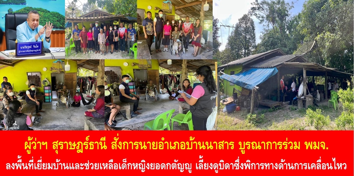 วันนี้ (25 มิ.ย. 66) นายวิชวุทย์ จินโต ผู้ว่าราชการจังหวัดสุราษฎร์ธานี เปิดเผยว่า ทางจังหวัดฯ ได้รับแจ้งจากพลเมืองดีว่า มีเด็กหญิงยอดกตัญญูในพื้นที่อำเภอบ้านนาสาร ที่ต้องเลี้ยงดูบิดาซึ่งเป็นผู้พิการทางด้านการเคลื่อนไหว มีความเป็นอยู่ยากลำบาก ซึ่งตนได้สั่งการให้ นายกัมปนาท กลิ่นเสาวคนธ์ นายอำเภอบ้านนาสาร นำทีมอำเภอบำบัดทุกข์ บำรุงสุขแบบบูรณาการอย่างยั่งยืน และองค์การบริหารส่วนตำบลทุ่งเตา ได้ร่วมกับนางสาวชลลดา ชนะศรีรัตนกุล พัฒนาสังคมและความมั่นคงของมนุษย์จังหวัดสุราษฎร์ธานี นำเจ้าหน้าที่สำนักงานพัฒนาสังคมและความมั่นคงของมนุษย์จังหวัดสุราษฎร์ธานี ลงเยี่ยมบ้านและตรวจสอบข้อเท็จจริงเพื่อให้ความช่วยเหลือเด็กหญิงชมาพร คงคช อายุ 14 ปี ที่ดูแลนายจเร คงคช อายุ 58 ปี ผู้เป็นบิดาซึ่งพิการทางด้านการเคลื่อนไหว