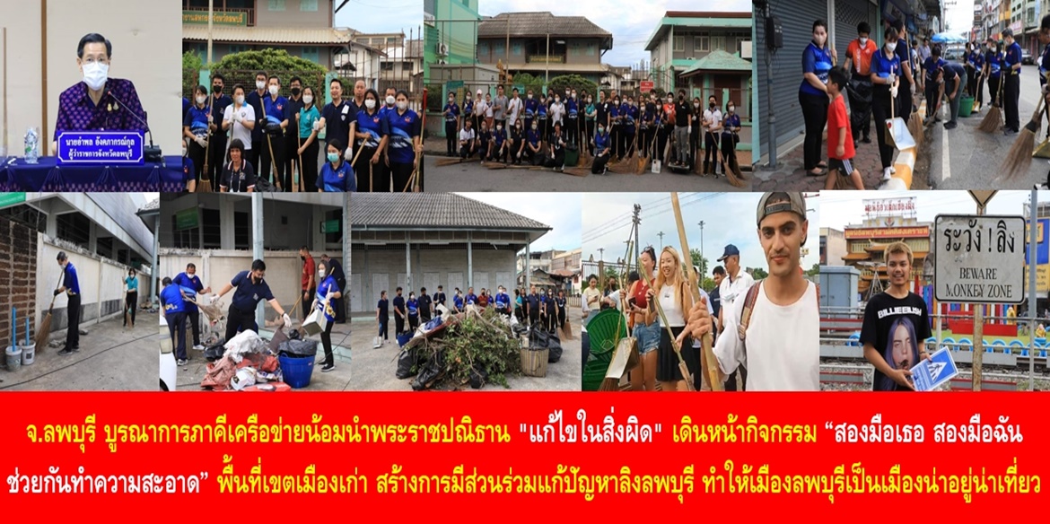 “เพื่อสร้างความร่วมมือของทุกภาคีเครือข่ายในการช่วยการดูแลรักษาความสะอาดและทำให้เมืองลพบุรีเป็นเมืองน่าอยู่น่าเที่ยว จังหวัดลพบุรี ได้บูรณาการภาคีเครือข่ายร่วมกันทำความสะอาดบริเวณเขตเมืองเก่าลพบุรี ภายใต้ชื่อกิจกรรม “สองมือเธอ สองมือฉัน ช่วยกันทำความสะอาด” โดยแยกทำความสะอาด 3 พื้นที่ คือ พื้นที่หน้าอาคารท่องเที่ยว ใกล้ศาลพระกาฬ ไปยังถนนราชดำเนินหน้าห้างอภิญญา พื้นที่หน้าร้านชโยวานิชไปยังโรงภาพยนตร์มาลัยรามา และพื้นที่ปรางค์แขกไปยังพระนารายณ์ราชนิเวศน์ เพื่อปรับปรุงภูมิทัศน์ พัฒนาเมือง โบราณสถาน สถานที่ราชการ สถานศึกษา ศาสนสถาน สถานที่ท่องเที่ยวต่าง ๆ ให้เป็นระเบียบเรียบร้อย เอื้อต่อการอยู่อาศัยของประชาชน” ผู้ว่าฯ ลพบุรี กล่าว