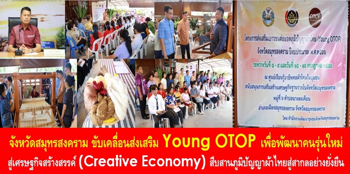 “จังหวัดสมุทรสงคราม ได้จัดโครงการส่งเสริมเยาวชนต่อยอดภูมิปัญญาผ้าไทย Young OTOP จังหวัดสมุทรสงคราม โดยมุ่งส่งเสริมให้คนรุ่นใหม่มีส่วนร่วมในการอนุรักษ์และสืบสานภูมิปัญญาผ้าไทย ซึ่งเป็นมรดกทางวัฒนธรรมอันล้ำค่าที่ต้องรักษาไว้ ตลอดจนการสร้างความรู้และพัฒนาทักษะการทอผ้าให้กับเยาวชนและทายาทของผู้ประกอบการ OTOP ในจังหวัดสมุทรสงคราม เพื่อสร้างมูลค่าเพิ่มผลิตภัณฑ์ให้สามารถตอบสนองต่อความต้องการของตลาด สามารถยกระดับมูลค่า OTOP ให้มีมาตรฐานและมีอัตลักษณ์เฉพาะมีความสร้างสรรค์และทันสมัยสามารถแข่งขันในตลาดสากลได้ โดยจัดขึ้นระหว่างวันที่ 8 – 9 กรกฎาคม และ 15 – 16 กรกฎาคม 2566 ซึ่งได้รับความร่วมมือจากนายอริย์ธัช ภิญโญกูล ผู้ประกอบการร้านคุณนายไหมไทย นางรุจาภา เนียนไธสง และนางปราณี ปาประโต เป็นวิทยากรให้ความรู้ และนำฝึกปฏิบัติ กิจกรรมตามหลักสูตรประกอบด้วย การสร้างความรู้ความเข้าใจแนวคิดการพัฒนาผ้าท้องถิ่น ประเภทผ้าแต่ละชนิด และความรู้เบื้องต้นเกี่ยวกับเครื่องมือ อุปกรณ์การทอผ้า การแบ่งกลุ่มฝึกปฏิบัติ เรื่อง การมัดหมี่ การฟอกย้อมเส้นไหม การทอผ้าไหมพื้น และการทอผ้าไหมมัดหมี่ ซึ่งกิจกรรมได้รับความสนใจจากนักเรียน นักศึกษาจากเขตพื้นที่การศึกษาประถมศึกษา พื้นที่การศึกษามัธยมศึกษา สมุทรสาคร – สมุทรสงคราม วิทยาลัยเทคนิคสมุทรสงคราม ร่วมกิจกรรม” นายสมนึก พรหมเขียว ผู้ว่าราชการจังหวัดสมุทรสงคราม กล่าว