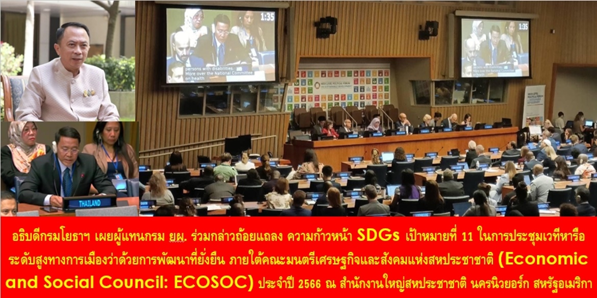 วันนี้ (18 ก.ค. 66) นายพงศ์รัตน์ ภิรมย์รัตน์ อธิบดีกรมโยธาธิการและผังเมือง เผยว่า กรมโยธาธิการและผังเมือง กระทรวงมหาดไทย โดยนายสุเมธ มีนาภา รองอธิบดีกรมโยธาธิการและผังเมือง ได้เข้าร่วมประชุมและกล่าวถ้อยแถลงรายงานความคืบหน้าของประเทศไทยในการดำเนินการตามเป้าหมายการพัฒนาที่ยั่งยืน (SDGs) เป้าหมายที่ 11 “Sustainable Cities and Communities ทำให้เมืองและการตั้งถิ่นฐานของมนุษย์มีความครอบคลุม ปลอดภัย มีภูมิต้านทานและยั่งยืน” ในการประชุมเวทีหารือระดับสูงทางการเมืองว่าด้วยการพัฒนาที่ยั่งยืน ภายใต้คณะมนตรีเศรษฐกิจและสังคมแห่งสหประชาชาติ (Economic and Social Council: ECOSOC) ประจำปี 2566 (High-Level Political Forum on Sustainable Development: HLPF 2023) ณ สำนักงานใหญ่สหประชาชาติ นครนิวยอร์ก สหรัฐอเมริกา