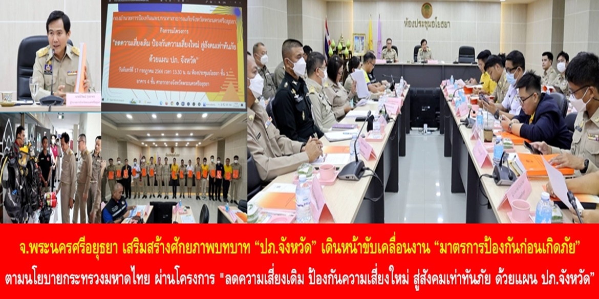 เมื่อวันที่ 18 ก.ค. 66 นายนิวัฒน์ รุ่งสาคร ผู้ว่าราชการจังหวัดพระนครศรีอยุธยา เปิดเผยว่า ในการประชุมติดตามผลการดำเนินงานตามภารกิจสำคัญของกระทรวงมหาดไทย นายสุทธิพงษ์ จุลเจริญ ปลัดกระทรวงมหาดไทย ได้เน้นย้ำถึงการขับเคลื่อนงานในทุกมิติเพื่อบำบัดทุกข์ บำรุงสุข โดยให้ผู้ว่าราชการจังหวัดได้ประสานการปฏิบัติร่วมกับส่วนราชการระดับกรมที่เกี่ยวข้อง เพื่อยกระดับการปฏิบัติงานในการดูแลคุณภาพชีวิตของพี่น้องประชาชนให้สามารถดำเนินชีวิตได้อย่างเป็นปกติสุข มีความปลอดภัยในชีวิตและทรัพย์สิน โดยเฉพาะอย่างยิ่งในภารกิจที่เกี่ยวข้องกับกรมป้องกันและบรรเทาสาธารณภัย ที่มีหน้าที่ในด้านการจัดทำแผนแม่บท วางมาตรการ ส่งเสริมสนับสนุน การป้องกัน บรรเทาและฟื้นฟูจากสาธารณภัย โดยกำหนดนโยบายด้านความปลอดภัย สร้างระบบป้องกัน เตือนภัย ฟื้นฟูหลังเกิดภัย และการติดตามประเมินผล เพื่อให้หลักประกันในด้านความมั่นคงปลอดภัยในชีวิตและทรัพย์สินของประชาชน