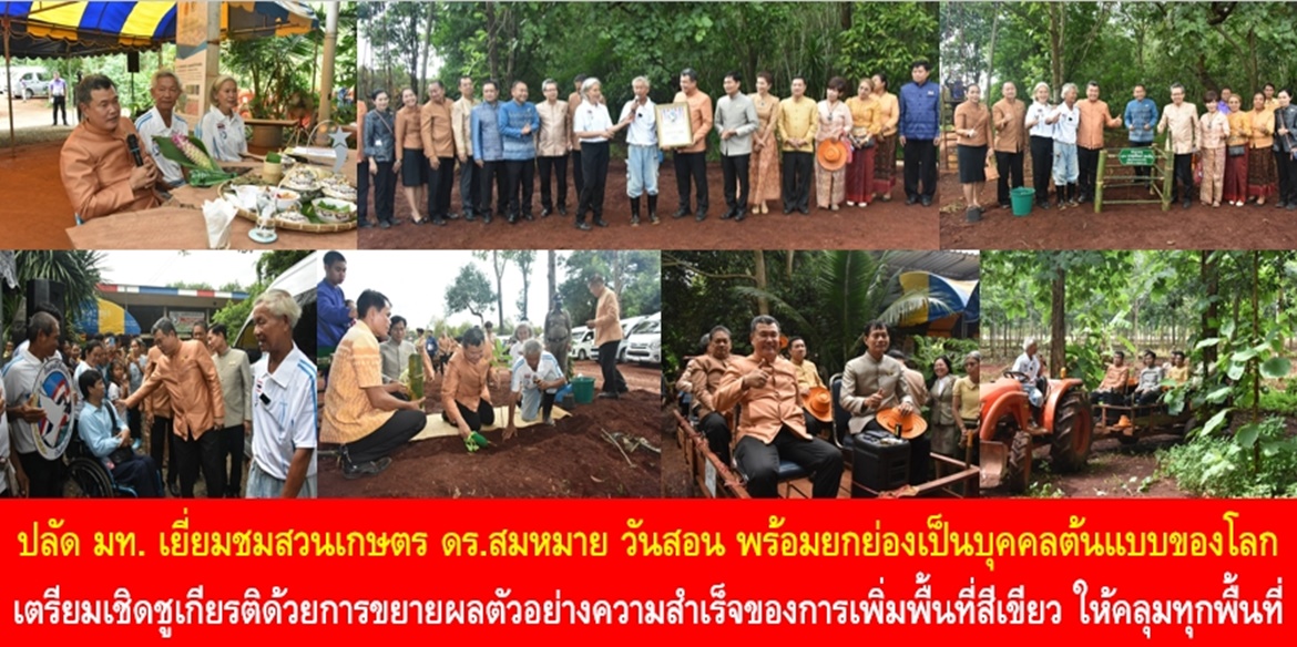 ดร.สมหมายฯ กล่าวต่ออีกว่า ดินที่ศรีสะเกษเป็นดินที่สมบูรณ์ เพราะได้อิทธิพลจากภูเขาไฟเดิม ทำให้มีสิ่งดี ๆ คือ 1) ดินดี 2) น้ำดี (น้ำฝนและน้ำใต้ดิน) 3) ผลผลิตดี โดยพื้นที่ในบริเวณศูนย์เรียนรู้นี้ แต่เดิมเป็นพื้นที่ว่าง เกษตรกรนิยมปลูกพืชล้มลุก จำพวกข้าวโพด มันสำปะหลัง ฟัก แฟง คนจึงมาให้ความรู้และเปลี่ยนเป็นเกษตรยืนต้น เพราะได้ให้แนวคิดว่า พืชล้มลุกไม่เป็นไร แต่คนปลูกจะล้มไม่ลุก จึงเปลี่ยนเป็นการเกษตรพืชยืนต้น 100% มีไม้ผล ไม้ยางพารา ไม้เศรษฐกิจต่าง ๆ ซึ่งตนขอชื่นชมแนวความคิดของท่านสุทธิพงษ์ จุลเจริญ ปลัดกระทรวงมหาดไทย ที่ได้กล่าวไว้ว่า “ในการที่เราจะเปลี่ยนคน เราต้องทำให้ดู เมื่อเราทำให้ดู เขาก็จะทำตาม” เช่น ตัว A ที่ท่านว่า คือ Agent ที่นี่ก็มีเกษตรกร มีผู้นำท้องถิ่น และมีคนมาศึกษาดูงานอบรมปีนึง 3-4 พันคน และที่นี่ก็เป็นศูนย์แก้จน ทุกคนที่ยากจนเราจะช่วย ส่งเสริมให้เขามีแรงบันดาลใจในการประกอบอาชีพ อาทิ ทำนา 1 ไร่ได้ 1 ตัน ปลูกข้าว 1 กอให้แตก 50 รวง ส่งเสริมให้เขามีงาน มีอาชีพ มีรายได้ สามารถดูแลตนเองให้ใช้ชีวิตอยู่ในสังคมได้อย่างมีความสุข และอีกประการหนึ่งคือการปลูกไม้ยืนต้นจำนวนมากก็จะส่งผลให้เกิดคาร์บอนเครดิตเพื่อที่จะส่งเสริมการแก้ไขปัญหาโลกร้อนอีกด้วย