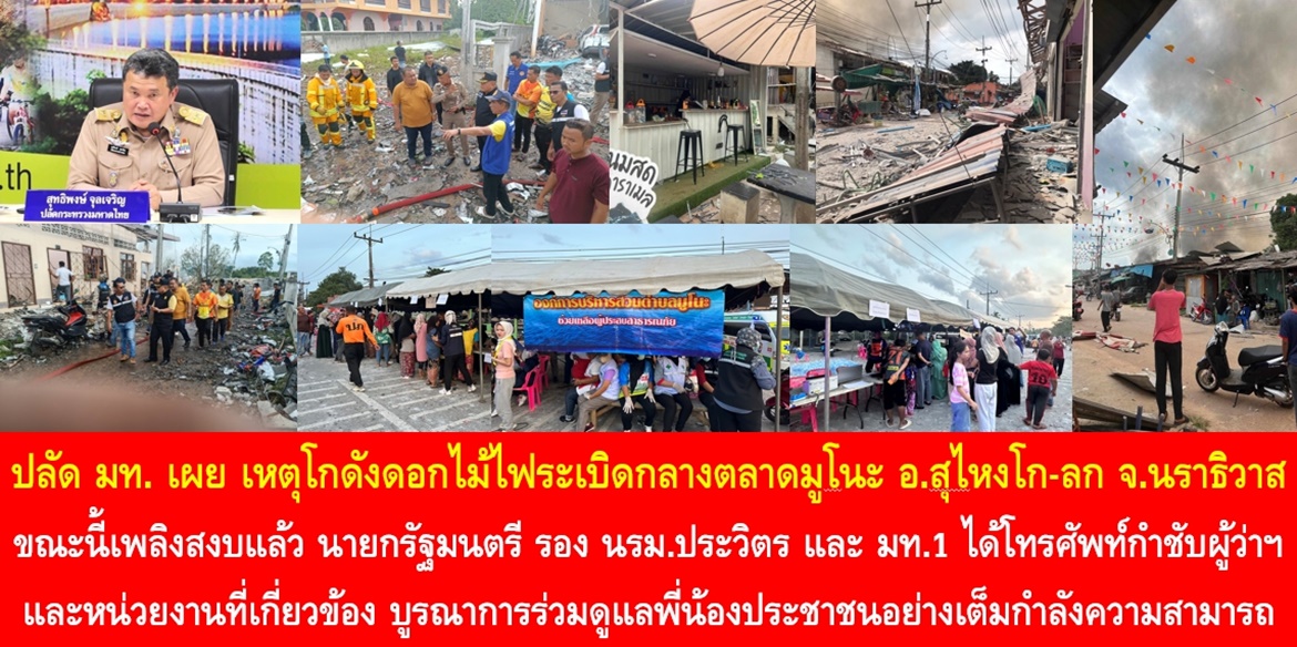 วันนี้ (29 ก.ค. 66) เวลา 18.30 น. นายสุทธิพงษ์ จุลเจริญ ปลัดกระทรวงมหาดไทย เปิดเผยว่า ตนได้รับรายงานจากนายสนั่น พงษ์อักษร ผู้ว่าราชการจังหวัดนราธิวาส ว่าเมื่อเวลา 15.05 น. วันนี้ ได้เกิดเหตุโกดังดอกไม้ไฟเพื่อจำหน่ายและส่งออกไปประเทศมาเลเซียระเบิด บริเวณตลาดมูโนะ หมู่ที่ 1 ตำบลมูโนะ อำเภอสุไหงโก-ลก จังหวัดนราธิวาส โดยผู้ว่าราชการจังหวัดนราธิวาสได้บูรณาการหน่วยงานที่เกี่ยวข้องสนับสนุนรถดับเพลิงพร้อมเจ้าหน้าที่ของระดมรถดับเพลิงจำนวน 10 คัน รถกู้ชีพ 17 คัน รถไฟฟ้า 1 คัน เครื่องปั่นไฟ 1 เครื่อง สปอร์ตไลท์ 5 ตัว เครื่องตัดถ่าง มีหน่วยงานที่ให้การช่วยเหลือ ได้แก่ กรมทหารราบที่ 151 ค่ายกัลยาณิวัฒนา ที่ทำการปกครองอำเภอสุไหงโกลก องค์การบริหารส่วนตำบลปาเสมัส องค์การบริหารส่วนตำบลมูโนะ องค์การบริหารส่วนตำบลป่าลุรู องค์การบริหารส่วนตำบลโฆษิต องค์การบริหารส่วนตำบลปูโยะ เทศบาลเมืองตากใบ องค์การบริหารส่วนตำบลสุไหงปาดี องค์การบริหารส่วนตำบลนานาค เข้าร่วมระงับเหตุ ซึ่งในขณะนี้เพลิงสงบลงแล้ว ทั้งได้บูรณาการหน่วยกู้ชีพกู้ภัยปาเสมัส ธารน้ำใจ ปูโยะ เมตตาธรรม ปะลุรู โฆษิต ขณะนี้ เจ้าหน้าที่อยู่ระหว่างการค้นหาผู้ที่อาจจะติดอยู่ใต้ซากปรักหักพังเพิ่มเติม ทั้งนี้ แรงระเบิดส่งผลทำให้มีพี่น้องประชาชนเสียชีวิตแล้ว จำนวน 9 ราย และบาดเจ็บ 115 ราย ในจำนวนนี้ เป็นกลุ่มที่มีอาการรุนแรงต้องรีบเข้ารับการรักษาตัวโดยเร็ว (โซนสีแดง) 14 ราย โดยได้จัดเตรียมแพทย์ในโรงพยาบาลสุไหงโก-ลก ซึ่งเป็นโรงพยาบาลทั่วไป มีศักยภาพเทียบเท่าโรงพยาบาลประจำจังหวัด และมีโรงพยาบาลใกล้เคียงในพื้นที่สำหรับรับผู้ป่วยเล็กน้อย ส่วนบ้านเรือนคาดว่าได้รับความเสียหายประมาณ 200 ครัวเรือน ซึ่งในขณะนี้ ศูนย์ป้องกันและบรรเทาสาธารณภัย เขต 12 สงขลา ได้สนับสนุนรถผลิตน้ำดื่มจำนวน 1 คัน และรถเครื่องกำเนิดไฟฟ้า 200 kva จำนวน 1 คัน พร้อมเจ้าหน้าที่ กำลังเดินทางไปในพื้นที่