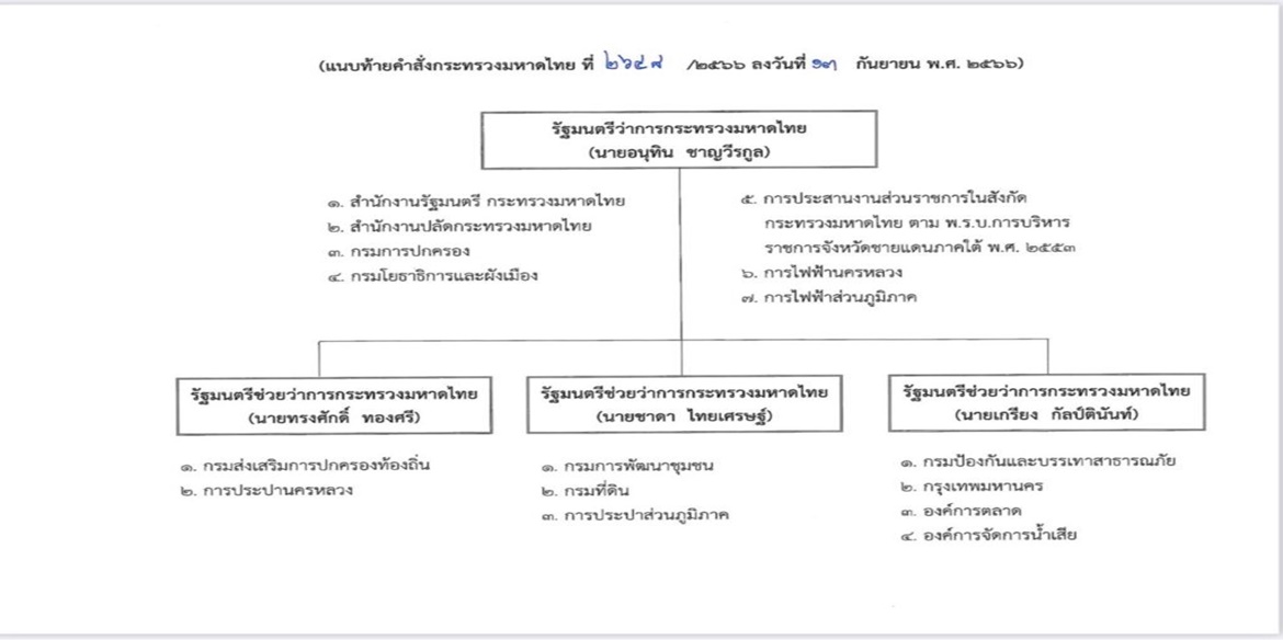โดยนายอนุทิน ชาญวีรกูล รองนายกรัฐมนตรีและรัฐมนตรีว่าการกระทรวงมหาดไทย สั่งและปฏิบัติราชการ สำนักงานรัฐมนตรีกระทรวงมหาดไทย สำนักงานปลัดกระทรวงมหาดไทย กรมการปกครอง กรมโยธาธิการและผังเมือง การประสานงานส่วนราชการในสังกัดกระทรวงมหาดไทยตามกฎหมายการบริหารราชการจังหวัดชายแดนภาคใต้ และกำกับดูแลการไฟฟ้านครหลวง และการไฟฟ้าส่วนภูมิภาค