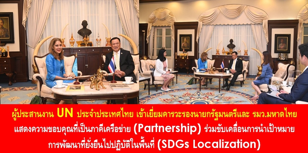 นายอนุทิน ชาญวีรกูล รองนายกรัฐมนตรีและรัฐมนตรีว่าการกระทรวงมหาดไทย ได้กล่าวขอบคุณผู้ประสานงานสหประชาชาติประจำประเทศไทย และคณะฯ ที่ร่วมแสดงความยินดี และร่วมหารือข้อราชการประเด็นที่เกี่ยวข้องกับการขับเคลื่อนเป้าหมายการพัฒนาที่ยั่งยืน (Sustainable Development Goals: SDGs) และการนำเป้าหมายการพัฒนาที่ยั่งยืนไปปฏิบัติในพื้นที่ (SDGs Localization) พร้อมกล่าวว่ากระทรวงมหาดไทยได้สนับสนุนความร่วมมือกับองค์การสหประชาชาติ (UN) อย่างเต็มกำลังในการขับเคลื่อนเป้าหมายการพัฒนาที่ยั่งยืน และกระทรวงมหาดไทยยังยินดีเป็นอย่างยิ่งที่ได้ร่วมมือกับ UN อย่างดีเสมอมา