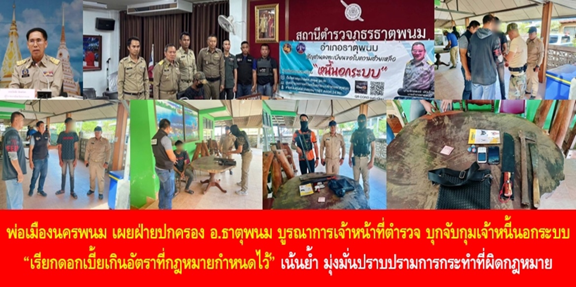 นายวันชัย จันทร์พร ผู้ว่าราชการจังหวัดนครพนม กล่าวว่า เมื่อวานนี้ฝ่ายปกครองอำเภอธาตุพนมนำโดยนายจักรพงษ์ ปทุมไกยะ นายอำเภอธาตุพนม กองร้อยอาสารักษาดินแดนอำเภอธาตุพนม ได้บูรณาการร่วมกับเจ้าหน้าที่ตำรวจชุดสืบสวน สภ.ธาตุพนม ลงพื้นที่บุกจับกุมผู้ต้องหาเจ้าหนี้นอกระบบ เป็นชายวัย 24 ปี พร้อมทั้งตรวจยึดของกลางสมุดบัญชีรายชื่อลูกค้าที่มีรายละเอียดการเก็บ/ชำระเงิน จำนวน 1 เล่ม โทรศัพท์มือถือ 2 เครื่อง อาวุธมีดและขวาน 3 ชิ้น โดยเจ้าหน้าที่ได้แจ้งข้อกล่าวหา “ให้บุคคลอื่นกู้ยืมเงินหรือกระทำการใด ๆ อันมีลักษณะเป็นการอำพรางการให้กู้ยืมเงิน โดยมีลักษณะเรียกดอกเบี้ยเกินอัตราที่กฎหมายกำหนดไว้” ก่อนที่จะนำตัวผู้ต้องหาพร้อมของกลางส่งพนักงานสอบสวน สภ.ธาตุพนม เพื่อดำเนินการตามกฎหมายต่อไป