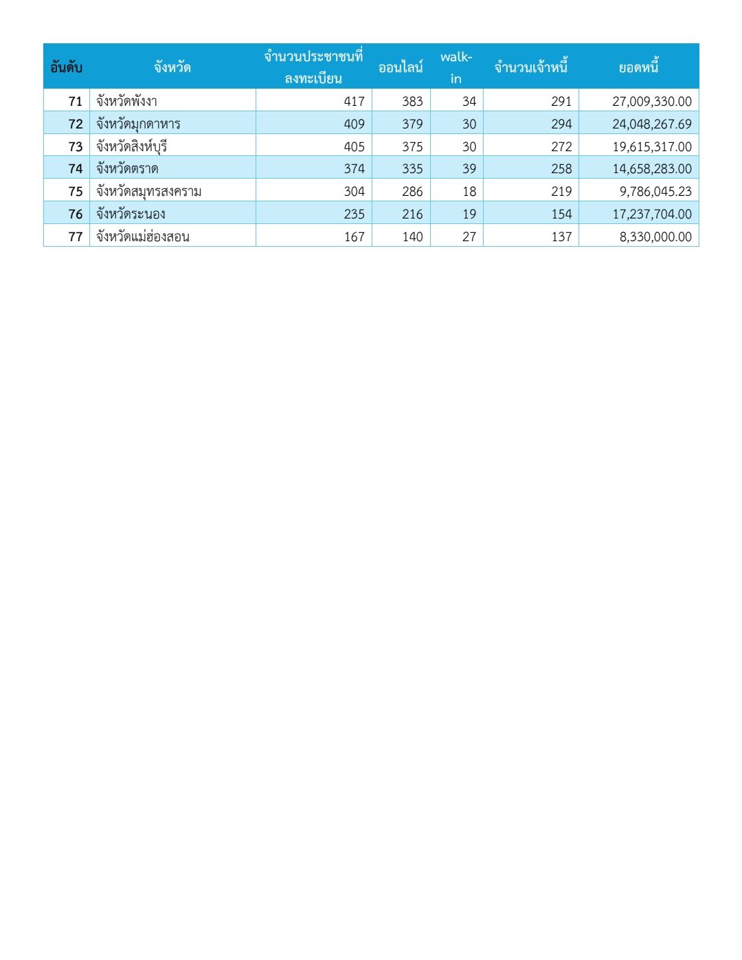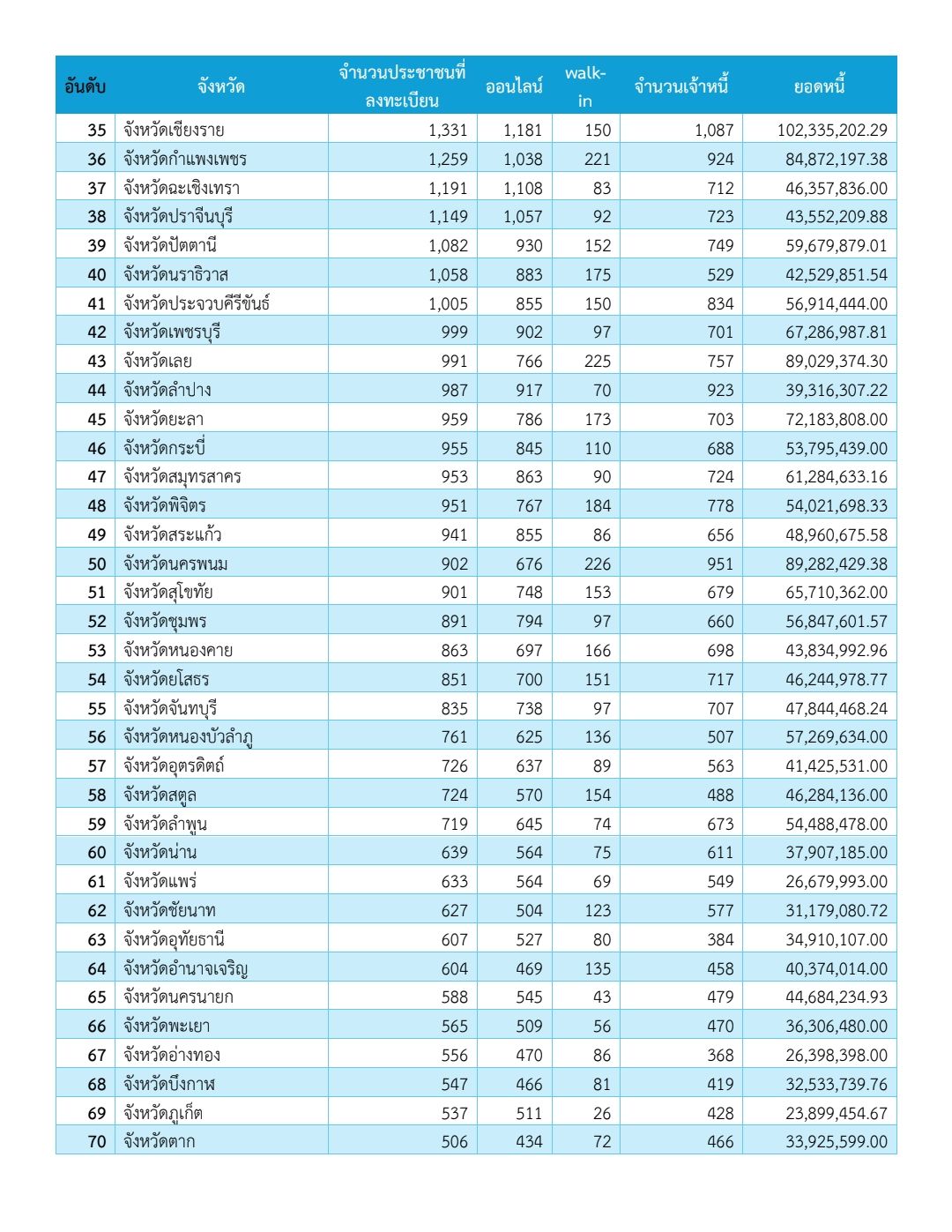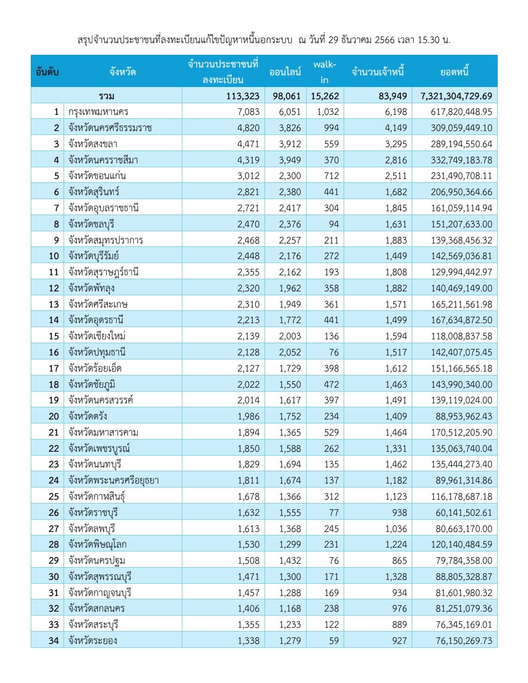 วันนี้ (29 ธ.ค. 66) นายสุทธิพงษ์ จุลเจริญ ปลัดกระทรวงมหาดไทย เปิดเผยถึงการลงทะเบียนแก้ไขปัญหาหนี้นอกระบบ ซึ่งเป็นวันที่ 29 นับตั้งแต่เปิดลงทะเบียน โดยจากข้อมูลของสำนักการสอบสวนและนิติการ กรมการปกครอง เมื่อเวลา 15.30 น. มีมูลหนี้รวม 7,321.304 ล้านบาท ประชาชนลงทะเบียนแล้ว 113,323 ราย โดยเป็นการลงทะเบียนผ่านระบบออนไลน์ 98,061 ราย และการลงทะเบียน ณ ศูนย์อำนวยการแก้ไขหนี้นอกระบบ 15,262 ราย รวมจำนวนเจ้าหนี้ 83,949 ราย มีพื้นที่/จังหวัดที่มีผู้ลงทะเบียนมากที่สุด 5 ลำดับแรก 1. กรุงเทพมหานคร ยังคงมากที่สุด มีผู้ลงทะเบียน 7,083 ราย เจ้าหนี้ 6,198 ราย มูลหนี้ 617.820 ล้านบาท 2. จังหวัดนครศรีธรรมราช มีผู้ลงทะเบียน 4,820 ราย เจ้าหนี้ 4,149 ราย มูลหนี้ 309.059 ล้านบาท 3. จังหวัดสงขลา มีผู้ลงทะเบียน 4,471 ราย เจ้าหนี้ 3,295 ราย มูลหนี้ 289.194 ล้านบาท 4. จังหวัดนครราชสีมา มีผู้ลงทะเบียน 4,319 ราย เจ้าหนี้ 2,816 ราย มูลหนี้ 332.749 ล้านบาท 5. จังหวัดขอนแก่น มีผู้ลงทะเบียน 3,012 ราย เจ้าหนี้ 2,511 ราย มูลหนี้ 231.490 ล้านบาท ขณะที่จังหวัดที่มีผู้ลงทะเบียนน้อยที่สุด 5 ลำดับแรก ได้แก่ 1. จังหวัดแม่ฮ่องสอน มีผู้ลงทะเบียน 167 ราย เจ้าหนี้ 137 ราย มูลหนี้ 8.330 ล้านบาท 2. จังหวัดระนอง มีผู้ลงทะเบียน 235 ราย เจ้าหนี้ 154 ราย มูลหนี้ 17.237 ล้านบาท 3. จังหวัดสมุทรสงคราม มีผู้ลงทะเบียน 304 ราย เจ้าหนี้ 219 ราย มูลหนี้ 9.786 ล้านบาท 4. จังหวัดตราด มีผู้ลงทะเบียน 374 ราย เจ้าหนี้ 258 ราย มูลหนี้ 14.658 ล้านบาท และ 5. จังหวัดสิงห์บุรี มีผู้ลงทะเบียน 405 ราย เจ้าหนี้ 272 ราย มูลหนี้ 19.615 ล้านบาท