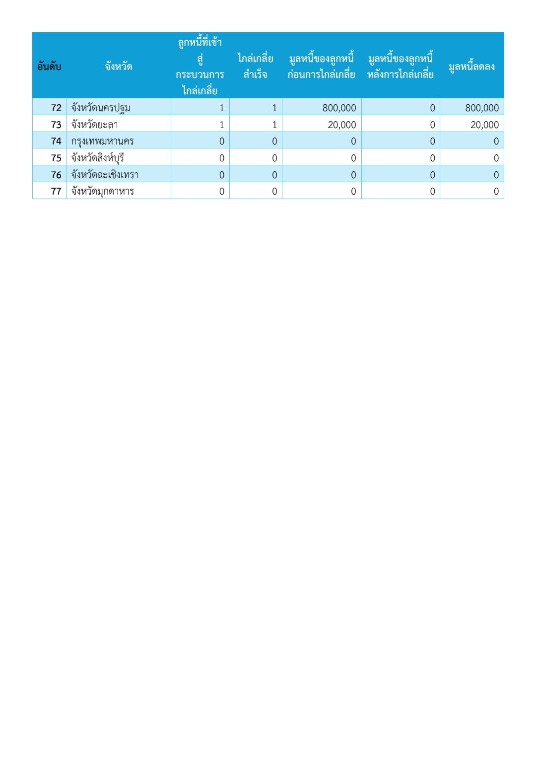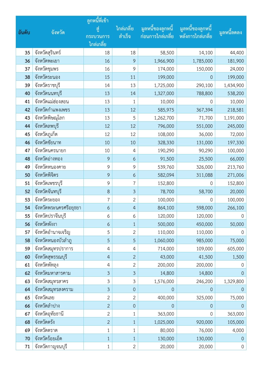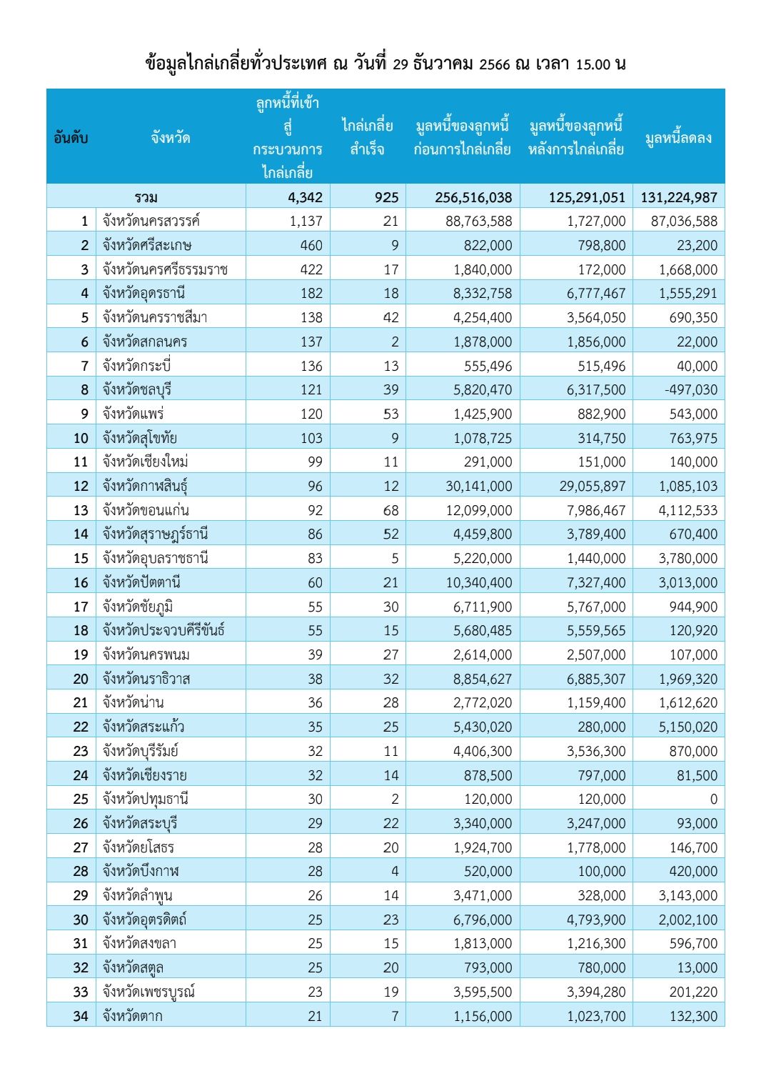 สำหรับข้อมูลการไกล่เกลี่ยหนี้นอกระบบทั่วประเทศ พบว่ามีลูกหนี้เข้าสู่กระบวนการไกล่เกลี่ยแล้ว 4,342 ราย ไกล่เกลี่ยสำเร็จ 925 ราย มูลหนี้ของลูกหนี้ก่อนไกล่เกลี่ย 256.516 ล้านบาท หลังการไกล่เกลี่ย 125.291 ล้านบาท มูลหนี้ลดลง 131.224 ล้านบาท ซึ่งจังหวัดที่สามารถนำลูกหนี้เข้าสู่กระบวนการไกล่เกลี่ยได้มากที่สุดยังคงเป็นจังหวัดนครสวรรค์ โดยมีลูกหนี้ที่เข้าสู่กระบวนการไกล่เกลี่ย 1,137 ราย ไกล่เกลี่ยสำเร็จ 21 ราย มูลหนี้ของลูกหนี้ก่อนไกล่เกลี่ย 88.763 ล้านบาท หลังการไกล่เกลี่ย 1.727 ล้านบาท ทำให้มูลหนี้ของพี่น้องประชาชนในจังหวัด ลดลงมากถึง 87.036 ล้านบาท