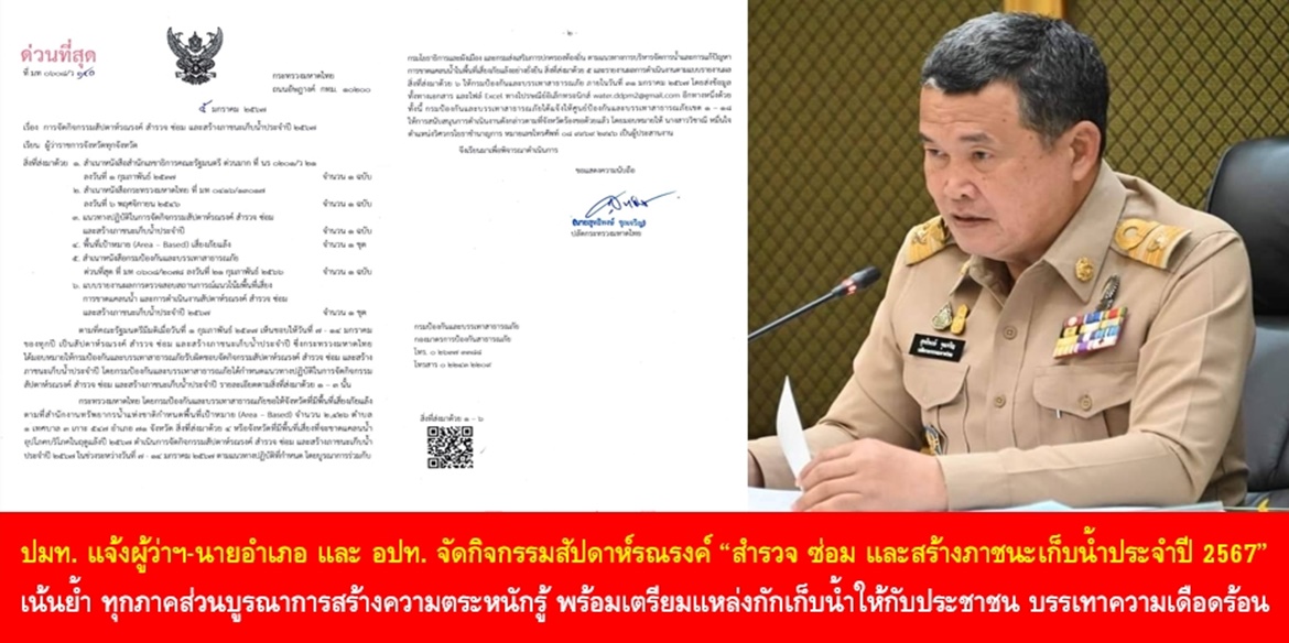 “นอกจากนี้ ยังได้สั่งการให้จังหวัดที่มีพื้นที่เสี่ยงภัยแล้งตามที่สำนักงานทรัพยากรน้ำแห่งชาติกำหนดพื้นที่เป้าหมาย (Area-based) จำนวน 2,426 ตำบล 1 เทศบาล 3 เกาะ 547 อำเภอ 71 จังหวัด หรือจังหวัดที่มีพื้นที่เสี่ยงที่จะขาดแคลนน้ำอุปโภคบริโภคในฤดูแล้งปี 2567 จัดกิจกรรมสัปดาห์รณรงค์ สำรวจ ซ่อม และสร้างภาชนะเก็บน้ำประจำปี 2567 ในช่วงระหว่างวันที่ 7 – 14 มกราคม 2567 ตามแนวทางปฏิบัติที่กำหนด โดยบูรณาการร่วมกับกรมโยธาธิการและผังเมืองและกรมส่งเสริมการปกครองท้องถิ่น ตามแนวทางการบริหารจัดการน้ำและการแก้ปัญหาการขาดแคลนน้ำในพื้นที่เสี่ยงภัยแล้งอย่างยั่งยืน พร้อมทั้งรายงานผลการดำเนินงานให้กรมป้องกันและบรรเทาสาธารณภัยทราบ” นายสุทธิพงษ์ฯ กล่าวเพิ่มเติม