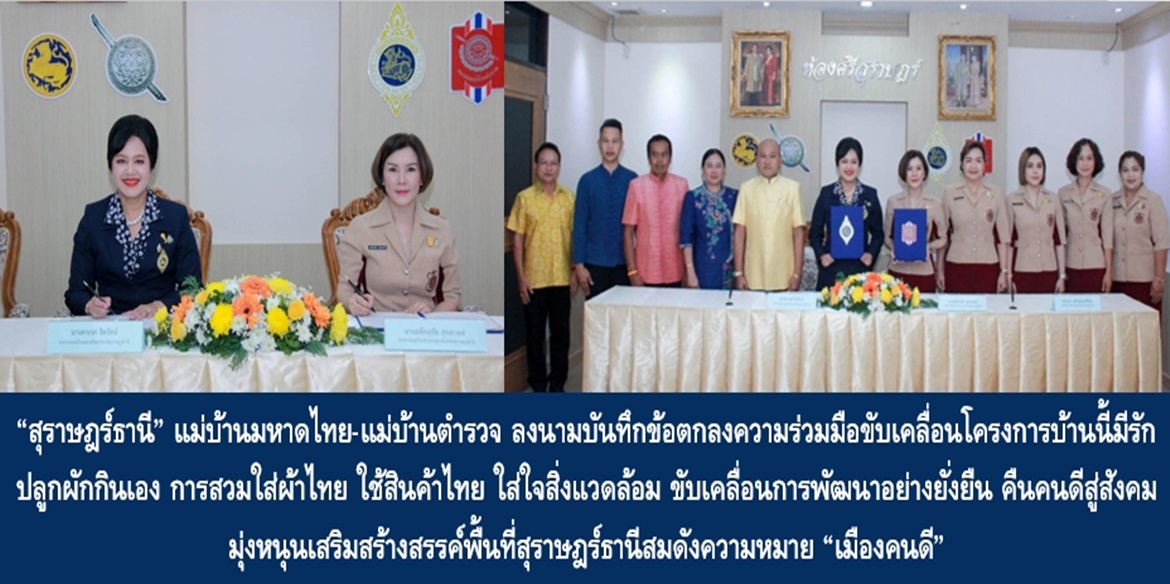 วันนี้ (10 ม.ค.67) นายเจษฎา จิตรัตน์ ผู้ว่าราชการจังหวัดสุราษฎร์ธานี เปิดเผยว่า นางดาเรศ จิตรัตน์ ประธานแม่บ้านมหาดไทยจังหวัดสุราษฎร์ธานี พร้อมด้วยนางสลักฤทัย สุขสาตต์ ประธานแม่บ้านตำรวจภูธรจังหวัดสุราษฎร์ธานี ร่วมลงนามในบันทึกข้อตกลงความร่วมมือในการขับเคลื่อนโครงการบ้านนี้มีรัก ปลูกผักกินเอง การคัดแยกขยะในครัวเรือน การขับเคลื่อนธนาคารขยะ การส่งเสริมการใช้และสวมใส่ผ้าไทย ควบคู่กับโครงการรวมพลังสร้างบ้านอุ่นรัก ร่วมสวมใส่ผ้าไทย ใช้สินค้าไทย ร่วมใส่ใจสิ่งแวดล้อม น้อมนำการพัฒนาอย่างยั่งยืน คืนคนดีสู่สังคม ซึ่งเป็นความมุ่งมั่นตั้งใจในการ Change for Good สร้างสรรค์สิ่งที่ดีให้เกิดขึ้นในสังคมจังหวัดสุราษฎร์ธานี โดยมี ตนพร้อมด้วยพลตำรวจตรี เสริมพันธุ์ ศิริคง ผู้บังคับการตำรวจภูธรจังหวัดสุราษฎร์ธานี ร่วมเป็นสักขีพยาน โดยมีนายกล้าณรงค์ ยุติธรรม หัวหน้าสำนักงานจังหวัดสุราษฎร์ธานี พร้อมด้วยหัวหน้าส่วนราชการ ข้าราชการ และเจ้าหน้าที่ ร่วมเป็นเกียรติในพิธี ณ ห้องศรีสุราษฎร์ ศาลากลางจังหวัดสุราษฎร์ธานี อ.เมืองสุราษฎร์ธานี จ.สุราษฎร์ธานี