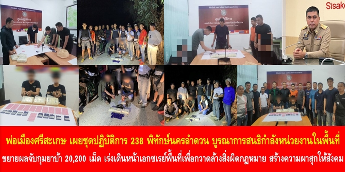 นายอนุพงศ์ สุขสมนิตย์ ผู้ว่าราชการจังหวัดศรีสะเกษ กล่าวว่า ชุดปฏิบัติการเฉพาะกิจปราบปรามและทำลายเครือข่ายการค้ายาเสพติดจังหวัดศรีสะเกษ หรือ “ชุดปฏิบัติการ 238 พิทักษ์นครลำดวน” ลงพื้นที่บริเวณริมถนนสาย 2111 พยุห์-ไพรบึง บ้านหนองทุ่ม อ.พยุห์ บูรณาการสนธิกำลังระหว่างฝ่ายปกครอง ตำรวจ ทหาร ป.ป.ส. ราชทัณฑ์ สมาชิก อส. ทำการสืบสวนขยายผลการจับกุมเครือข่ายยาเสพติด ร่วมกันจับกุมผู้ต้องหาจำนวน 2 ราย นายธนวัฒน์ อายุ 28 ปี และนายประจักษ์ อายุ 19 ปี พร้อมของกลางยาบ้า 20,200 เม็ด โดยเจ้าพนักงานได้แจ้งข้อกล่าวหา มียาเสพติดให้โทษประเภท 1 แอมเฟตามีนหรือยาบ้าชนิดร้ายแรง โดยการมีไว้เพื่อจำหน่ายอันมีลักษณะเพื่อการค้า อันก่อให้เกิดการแพร่ หลายในกลุ่มประชาชน และทำให้เกิดผลกระทบต่อความมั่นคงของรัฐหรือความปลอดภัยของประชาชนทั่วไป และตรวจยึดทรัพย์สินไว้ตรวจสอบตามประมวลกฎหมายยาเสพติด พ.ศ.2564 เป็นรถจักรยานยนต์ จำนวน 1 คัน ราคาประมาณ 50,000 บาท และนำตัวผู้ต้องหาพร้อมของกลาง ส่งพนักงานสอบสวน สภ.พยุห์ จ.ศรีสะเกษ ดำเนินคดีตามกฎหมายต่อไป