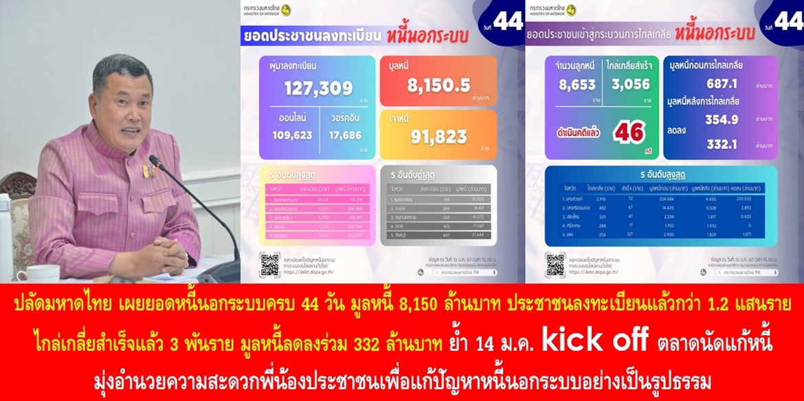 เมื่อวันที่ 13 ม.ค. 67 นายสุทธิพงษ์ จุลเจริญ ปลัดกระทรวงมหาดไทย เปิดเผยถึงการลงทะเบียนแก้ไขปัญหาหนี้นอกระบบ เป็นวันที่ 44 นับตั้งแต่เปิดลงทะเบียนเมื่อวันที่ 1 ธันวาคม 2566 เป็นต้นมา โดยจากข้อมูลของสำนักการสอบสวนและนิติการ กรมการปกครอง เมื่อเวลา 15.30 น. มีมูลหนี้รวม 8,150.559 ล้านบาท ประชาชนลงทะเบียนแล้ว 127,309 ราย เป็นการลงทะเบียนผ่านระบบออนไลน์ 109,623 ราย และการลงทะเบียน ณ ศูนย์อำนวยการแก้ไขหนี้นอกระบบ 17,686 ราย รวมจำนวนเจ้าหนี้ 91,823 ราย มีพื้นที่/จังหวัดที่มีผู้ลงทะเบียนมากที่สุด 5 ลำดับแรก 1. กรุงเทพมหานคร ยังคงมากที่สุด มีผู้ลงทะเบียน 10,614 ราย เจ้าหนี้ 6,688 ราย มูลหนี้ 741.319 ล้านบาท 2. จังหวัดนครศรีธรรมราช มีผู้ลงทะเบียน 5,201 ราย เจ้าหนี้ 4,477 ราย มูลหนี้ 336.903 ล้านบาท 3. จังหวัดนครราชสีมา มีผู้ลงทะเบียน 4,750 ราย เจ้าหนี้ 3,068 ราย มูลหนี้ 354.451 ล้านบาท 4. จังหวัดสงขลา มีผู้ลงทะเบียน 4,746 ราย เจ้าหนี้ 3,520 ราย มูลหนี้ 306.383 ล้านบาท 5. จังหวัดขอนแก่น มีผู้ลงทะเบียน 3,314 ราย เจ้าหนี้ 2,684 ราย มูลหนี้ 263.509 ล้านบาท ขณะที่จังหวัดที่มีผู้ลงทะเบียนน้อยที่สุด 5 ลำดับแรก ได้แก่ 1. จังหวัดแม่ฮ่องสอน มีผู้ลงทะเบียน 194 ราย เจ้าหนี้ 158 ราย มูลหนี้ 10.003 ล้านบาท 2. จังหวัดระนอง มีผู้ลงทะเบียน 269 ราย เจ้าหนี้ 184 ราย มูลหนี้ 18.411 ล้านบาท 3. จังหวัดสมุทรสงคราม มีผู้ลงทะเบียน 330 ราย เจ้าหนี้ 238 ราย มูลหนี้ 10.572 ล้านบาท 4. จังหวัดตราด มีผู้ลงทะเบียน 413 ราย เจ้าหนี้ 304 ราย มูลหนี้ 17.561 ล้านบาท และ 5. จังหวัดสิงห์บุรี มีผู้ลงทะเบียน 447 ราย เจ้าหนี้ 303 ราย มูลหนี้ 21.644 ล้านบาท