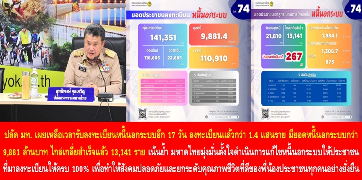 นายสุทธิพงษ์ จุลเจริญ ปลัดกระทรวงมหาดไทย กล่าวต่ออีกว่า กระทรวงมหาดไทย ได้ดำเนินการรับลงทะเบียนหนี้นอกระบบมาอย่างต่อเนื่อง โดยยังเหลือระยะเวลาเปิดรับอีกประมาณ 2 สัปดาห์ ซึ่งหน่วยงานภาครัฐได้บูรณาการช่วยเหลือพี่น้องประชาชนในเรื่องนี้อย่างเต็มที่ เราได้รับความร่วมมือจากทุกภาคส่วนไม่ว่าจะเป็นสำนักงานตำรวจแห่งชาติ สำนักงานอัยการ กระทรวงแรงงาน กระทรวงการคลัง กระทรวงการพัฒนาสังคมและความมั่นคงของมนุษย์ องค์กรปกครองส่วนท้องถิ่น ตลอดจนกำนันผู้ใหญ่บ้าน ซึ่งเราได้ร่วมกันขับเคลื่อนตามนโยบายของรัฐบาล โดยนายเศรษฐา ทวีสิน นายกรัฐมนตรี มีความมุ่งมั่นในการที่จะช่วยแก้ปัญหาความเดือดร้อนให้กับพี่น้องประชาชน โดยเฉพาะอย่างยิ่งกับคนที่เป็นหนี้นอกระบบ เพราะต้องชำระดอกเบี้ยสูงมากและเกินกว่าที่กฎหมายกำหนด อีกทั้งยังมีกระบวนการวิธีการทวงหนี้ที่ใช้ความรุนแรงโหดร้ายทารุณ ซึ่งนายกรัฐมนตรีได้เปรียบเปรยว่าคนที่เป็นหนี้นอกระบบเปรียบเสมือน “ทาสยุคใหม่” ดังนั้น เราจึงเต็มใจที่จะร่วมไม้ร่วมมือเชิญชวนพี่น้องประชาชนที่มีปัญหาความเดือดร้อนให้มาลงทะเบียนเพื่อแก้ไขปัญหาหนี้นอกระบบเพื่อดำเนินการให้การช่วยเหลือโดยทันที