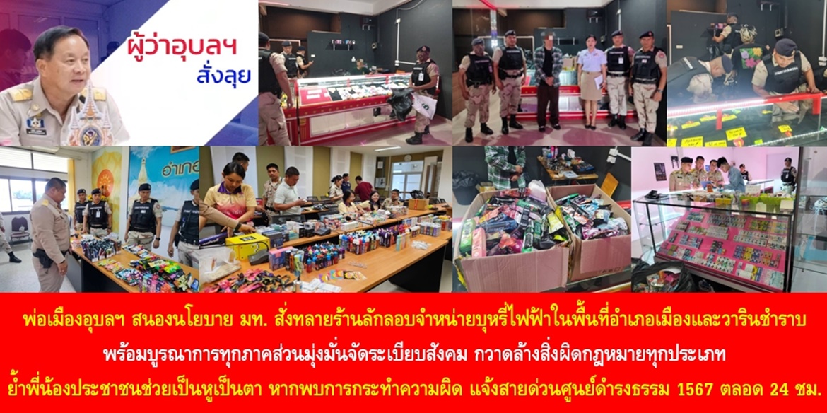 นายศุภศิษย์ กอเจริญยศ ผู้ว่าราชการจังหวัดอุบลราชธานี กล่าวว่า สืบเนื่องจากศูนย์ดำรงธรรมจังหวัดอุบลราชธานีได้รับเรื่องร้องจากประชาชนว่ามีการลักลอบจำหน่ายบุหรี่ไฟฟ้าและน้ำยาบุหรี่ไฟฟ้าให้กับเด็ก เยาวชน และประชาชนในพื้นที่ จึงได้สั่งการให้นายสมมาฏฐ์ โพธิ ปลัดจังหวัดอุบลราชธานี พร้อมด้วยนายโรมรัก ภูหวล ป้องกันจังหวัดอุบลราชธานี นำชุดปฏิบัติการพิเศษฝ่ายปกครองจังหวัดอุบลราชธานี สมาชิกกองร้อยอาสารักษาดินแดนจังหวัดอุบลราชธานีที่ 1 บูรณาการสนธิกำลังร่วมกับชุดปฏิบัติการพิเศษฝ่ายปกครองอำเภอเมืองอุบลราชธานี และชุดปฏิบัติการพิเศษฝ่ายปกครองอำเภอวารินชำราบ ดำเนินการเข้าตรวจสอบร้านลักลอบจำหน่ายบุหรี่ไฟฟ้าในพื้นที่อำเภอเมืองอุบลราชธานี 1 ร้าน และพื้นที่อำเภอวารินชำราบ 1 ร้าน รวมเป็น 2 ร้าน