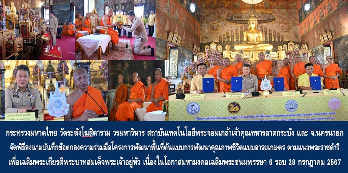 เมื่อวันที่ 22 เม.ย. 67 เวลา 14.00 น. ที่พระอุโบสถวัดระฆังโฆสิตาราม วรมหาวิหาร แขวงศิริราช เขตบางกอกน้อย กรุงเทพมหานคร นายสุทธิพงษ์ จุลเจริญ ปลัดกระทรวงมหาดไทย เป็นประธานพิธีลงนามบันทึกข้อตกลงความร่วมมือโครงการพัฒนาพื้นที่ต้นแบบการพัฒนาคุณภาพชีวิตแบบอารยเกษตร ตามแนวพระราชดำริ เพื่อเฉลิมพระเกียรติพระบาทสมเด็จพระเจ้าอยู่หัว เนื่องในโอกาสมหามงคลเฉลิมพระชนมพรรษา 6 รอบ 28 กรกฎาคม 2567 ระหว่างกระทรวงมหาดไทย วัดระฆังโฆสิตาราม วรมหาวิหาร สถาบันเทคโนโลยีพระจอมเกล้าเจ้าคุณทหารลาดกระบัง และจังหวัดนครนายก โดยได้รับเมตตาจากพระมหาปรีชา ปสนฺโน ผู้ช่วยเจ้าอาวาสวัดระฆังโฆสิตาราม วรมหาวิหาร เลขานุการวัดระฆังโฆสิตาราม วรมหาวิหาร เป็นผู้แทนพระเทพประสิทธิคุณ เจ้าอาวาสวัดระฆังโฆสิตาราม วรมหาวิหาร ร่วมลงนาม โดยมี รศ.สุพจน์ ศรีนิล รองอธิการบดี ปฏิบัติหน้าที่แทนอธิการบดีสถาบันเทคโนโลยีพระจอมเกล้าเจ้าคุณทหารลาดกระบัง และนายสุภกิณห์ แวงชิน ผู้ว่าราชการจังหวัดนครนายก ร่วมลงนาม โอกาสนี้ พระพิพัฒน์วชิโรภาส เจ้าอาวาสวัดป่ามหาธีราจารย์ ที่ปรึกษาปลัดกระทรวงมหาดไทย พระครูสุภัทรธรรมโฆษิต พระครูพิพิธวรกิจจาทร พระครูสังฆรักษ์อำพล จตฺตมโล พระครูวินัยธรสมชาย ปุปฺผโก ผู้ช่วยเจ้าอาวาสวัดระฆังโฆสิตาราม พระเถรานุเถระ นายอรรษิษฐ์ สัมพันธรัตน์ อธิบดีกรมการปกครอง นายพงศ์รัตน์ ภิรมย์รัตน์ อธิบดีกรมโยธาธิการและผังเมือง นายสยาม ศิริมงคล อธิบดีกรมการพัฒนาชุมชน รศ.วรวรรณ โรจนไพบูลย์ นายประสพโชค อยู่สำราญ ที่ปรึกษาปลัดกระทรวงมหาดไทย นายธนันท์รัฐ ธนเสฏฐการย์ ที่ปรึกษาโครงการผ้าไทยใส่ให้สนุก นายเปลี่ยน แก้วฤทธิ์ รกน.ที่ปรึกษาด้านประสิทธิภาพ กรมที่ดิน นายสุรพล เจริญภูมิ รองอธิบดีกรมส่งเสริมการปกครองท้องถิ่น นางสาวชัชดาพร บุญพีระณัช รองอธิบดีกรมป้องกันและบรรเทาสาธารณภัย นายวิลาศ เฉลยสัตย์ ผู้ว่าการการไฟฟ้านครหลวง นายบูรณิศ ยุกตะนันทน์ ผู้อำนวยการองค์การตลาด ข้าราชการ พนักงาน เจ้าหน้าที่ และภาคีเครือข่าย ร่วมในพิธี