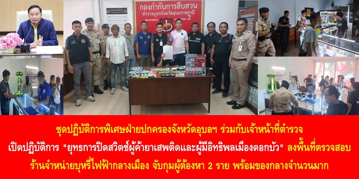 วันนี้ (3 พ.ค. 67) นายศุภศิษย์ กอเจริญยศ ผู้ว่าราชการจังหวัดอุบลราชธานี เปิดเผยว่า จังหวัดอุบลราชธานี ได้ดำเนินการขับเคลื่อนตามนโยบายของกระทรวงมหาดไทยในการจัดระเบียบสังคม ปราบปรามผู้มีอิทธิพล และการป้องกันแก้ไขปัญหายาเสพติด ซึ่งที่ผ่านมาจังหวัดอุบลราชธานีได้บูรณาการทุกภาคส่วนดำเนินมาตรการเข้มงวดกวดขันเกี่ยวกับยาเสพติดและสิ่งผิดกฎหมายทุกชนิดอย่างจริงจังและต่อเนื่อง โดยล่าสุดตนได้สั่งการให้ นายโรมรัก ภูหวล ป้องกันจังหวัดอุบลราชธานี นำชุดปฎิบัติการพิเศษฝ่ายปกครองจังหวัดอุบลราชธานี บูรณาการร่วมกับเจ้าหน้าที่ตำรวจ กองกำกับการสืบสวนภูธรจังหวัดอุบลราชธานี ปฎิบัติการเข้าตรวจร้านจำหน่ายบุหรี่ไฟฟ้าในเขตอำเภอเมืองอุบลราชธานี พบร้านค้ามีการจำหน่ายบุหรี่ไฟฟ้า และอุปกรณ์ตามข้อร้องเรียนจากประชาชนจริง