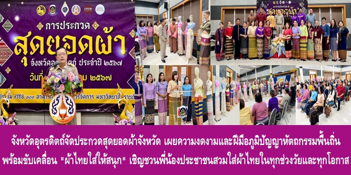นายศิริวัฒน์ บุปผาเจริญ ผู้ว่าราชการจังหวัดอุตรดิตถ์ กล่าวว่า การจัดประกวดผ้าไทยฯ ในครั้งนี้ มีวัตถุประสงค์เพื่อส่งเสริมพัฒนาภูมิปัญญาผ้าไทย สืบสานพระราชปณิธานสมเด็จพระนางเจ้าสิริกิติ์ พระบรมราชินีนาถ พระบรมราชชนนีพันปีหลวง และขับเคลื่อนโครงการ “ผ้าไทยใส่ให้สนุก” ตามแนวพระดำริของสมเด็จพระเจ้าลูกเธอ เจ้าฟ้าสิริวัณณวรี นารีรัตนราชกัญญา รวมทั้งเป็นการผลักดันมาตรการส่งเสริมและสนับสนุนการใช้และสวมใส่ผ้าไทย ตลอดจนเพื่อค้นหาสุดยอดผ้าจังหวัดให้ได้ผืนผ้าที่เป็นที่สุดของจังหวัดอุตรดิตถ์ ซึ่งผืนที่ได้รับรางวัลชนะเลิศของจังหวัด จะนำขึ้นทูลเกล้า ฯ ถวายสมเด็จพระนางเจ้า ฯ พระบรมราชินี เนื่องในวันเฉลิมพระชนมพรรษา 3 มิถุนายน 2567 โดยในวันนี้ตนพร้อมด้วยคณะอำนวยการประกวดสุดยอดผ้าฯได้เข้าร่วมพิจารณาตัดสินให้คะแนน เพื่อคัดเลือกผ้าทอพื้นถิ่นที่เป็นสุดยอดของจังหวัดอุตรดิตถ์ โดยมีผู้เข้าร่วมกิจกรรม ได้แก่หัวหน้าส่วนราชการจังหวัดอุตรดิตถ์ รองนายกเหล่ากาชาดจังหวัดอุตรดิตถ์ นายอำเภอ ผู้บริหารสถานศึกษา ผู้บริหารองค์กรส่วนท้องถิ่น ผู้ทรงคุณวุฒิ เครือข่ายโอทอปอุตรดิตถ์ ผู้แทนบริษัทประชารัฐรักสามัคคีอุตรดิตถ์ฯ ตลอดจนผู้ผลิตผู้ประกอบการ ประเภทผ้าทอและเครื่องแต่งกาย ซึ่งจังหวัดอุตรดิตถ์มีผู้สนใจส่งผ้าไทยเข้าประกวดรวมทั้งสิ้น 20 ผืน จาก 5 อำเภอ โดยมีเงินรางวัลที่ได้รับการสนับสนุนจากชมรมแม่บ้านมหาดไทย จังหวัดอุตรดิตถ์ บริษัทประชารัฐรักสามัคคีอุตรดิตถ์ (วิสาหกิจเพื่อสังคม) จำกัด และคณะกรรมการเครือข่าย OTOP จังหวัดอุตรดิตถ์ รวมทั้งสิ้น 30,000 บาท ซึ่งผลการประกวด ผ้าที่ได้รับรางวัลชนะเลิศ ได้แก่ผ้าของกลุ่มทอผ้าบ้านคุ้ม อำเภอลับแล รองชนะเลิศได้แก่ผ้ากลุ่มทอผ้าบ้านน้ำอ่าง อำเภอตรอน