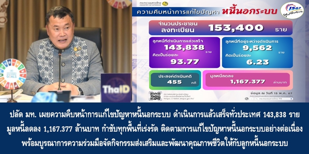เมื่อวันที่ 15 พ.ค. 67 นายสุทธิพงษ์ จุลเจริญ ปลัดกระทรวงมหาดไทย เปิดเผยว่า จากการที่กระทรวงมหาดไทยได้เปิดรับลงทะเบียนให้ประชาชนที่มีความประสงค์ให้ทางราชการช่วยแก้ไขปัญหาหนี้นอกระบบตามนโยบายรัฐบาล โดยมีประชาชนมาลงทะเบียนรวมทั้งสิ้น 153,400 ราย กระทรวงมหาดไทยจึงได้แจ้งให้ทุกจังหวัด อำเภอ เดินหน้าแก้ไขปัญหาหนี้นอกระบบอย่างต่อเนื่องด้วยการเชิญเจ้าหนี้และลูกหนี้มาเข้าสู่กระบวนการเจรจาไกล่เกลี่ยหนี้ โดยเมื่อเวลา 15.00 น. สำนักการสอบสวนและนิติการ กรมการปกครอง ได้รายงานข้อมูลความคืบหน้าแก้ไขปัญหาหนี้นอกระบบทั่วประเทศ มีลูกหนี้ที่ดำเนินการแล้วเสร็จ จำนวน 143,838 ราย มูลหนี้ลดลงรวม 1,167.377 ล้านบาท โดยยังคงเหลืออีก 9,562 ราย ที่อยู่ระหว่างการดำเนินกระบวนการไกล่เกลี่ย ซึ่งขณะนี้ทางเจ้าหน้าที่ได้เชิญเจ้าหนี้และลูกหนี้มาพบปะพูดคุยกัน เพื่อให้การแก้ไขปัญหาหนี้นอกระบบประสบความสำเร็จครบทั้งกระบวนการต่อไป นอกจากนี้ มีกรณีที่เจ้าหนี้-ลูกหนี้มีความประสงค์ให้เจ้าหน้าที่ได้ส่งต่อเรื่องไปยังพนักงานสอบสวนของสถานีตำรวจในพื้นที่ดำเนินคดี 455 คดี