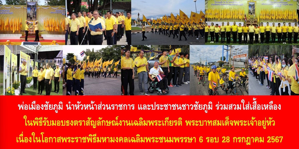 นายอนันต์ นาคนิยม ผู้ว่าราชการจังหวัดชัยภูมิ กล่าวว่า จังหวัดชัยภูมิ ได้รับมอบธงตราสัญลักษณ์ฯ เป็นจังหวัดลำดับที่ 8 ของสายที่ 4 ซึ่งได้รับจากจังหวัดขอนแก่นเป็นจังหวัดล่าสุด ซึ่งจังหวัดชัยภูมิ จะนำธงตราสัญลักษณ์ฯ มาจัดกิจกรรมเดิน วิ่ง ปั่น ธงตราสัญลักษณ์ เนื่องในโอกาสพระราชพิธีมหามงคลเฉลิมพระชนมพรรษา 6 รอบ 28 กรกฎาคม 2567 เพื่อเป็นการเฉลิมพระเกียรติ พระบาทสมเด็จพระเจ้าอยู่หัว เนื่องในโอกาสมหามงคลเฉลิมพระชนมพรรษา 6 รอบ 28 กรกฎาคม 2567 โดยจะมีการจัดกิจกรรมซึ่งเป็นการแสดงออกถึงความจงรักภักดีของพสกนิกรชาวไทยที่มีต่อพระบาทสมเด็จพระเจ้าอยู่หัว ตลอดจนส่งเสริมให้ทุกภาคส่วนในพื้นที่ของทุกจังหวัดได้มีส่วนร่วมในการแสดงความจงรักภักดีและสำนึกในพระมหากรุณาธิคุณของพระบาทสมเด็จพระเจ้าอยู่หัว ด้วยการปฏิบัติบูชาโดยน้อมนำแนวทางในเรื่องการดูแลสุขภาพพลานามัยด้วยการออกกำลังกาย ไม่ว่าจะเป็นการเดิน การวิ่ง หรือ การปั่นจักรยาน