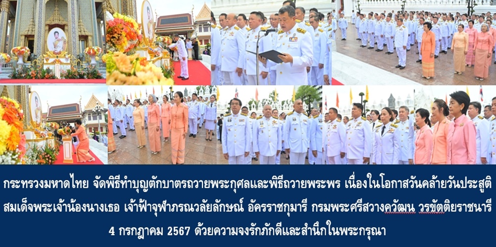 วันนี้ (4 ก.ค. 67) เวลา 07.10 น. ที่วัดราชบพิธสถิตมหาสีมาราม ราชวรวิหาร เขตพระนคร กรุงเทพฯ นายสุทธิพงษ์ จุลเจริญ ปลัดกระทรวงมหาดไทย พร้อมด้วย ดร.วันดี กุญชรยาคง จุลเจริญ นายกสมาคมแม่บ้านมหาดไทย เป็นประธานพิธีทำบุญตักบาตรถวายพระกุศลและพิธีถวายพระพร เนื่องในโอกาสวันคล้ายวันประสูติ สมเด็จพระเจ้าน้องนางเธอ เจ้าฟ้าจุฬาภรณวลัยลักษณ์ อัครราชกุมารี กรมพระศรีสวางควัฒน วรขัตติยราชนารี 4 กรกฎาคม 2567 โดยมี นายโชตินรินทร์ เกิดสม รองปลัดกระทรวงมหาดไทย หัวหน้ากลุ่มภารกิจด้านสาธารณภัยและพัฒนาเมือง นายเชษฐา โมสิกรัตน์ รองปลัดกระทรวงมหาดไทย ด้านบริหาร นายพรพจน์ เพ็ญพาส อธิบดีกรมที่ดิน นายสยาม ศิริมงคล อธิบดีกรมการพัฒนาชุมชน นายขจร ศรีชวโนทัย อธิบดีกรมส่งเสริมการปกครองท้องถิ่น นายไชยวัฒน์ จุนถิระพงศ์ อธิบดีกรมป้องกันและบรรเทาสาธารณภัย นายณัฐวัสส์ วิริยานภาภรณ์ หัวหน้าผู้ตรวจราชการกระทรวงมหาดไทย พร้อมด้วยนายวัชรเดช เกียรติชานน นายวีระพันธ์ ดีอ่อน นายชำนาญ ชื่นตา นายศรัณยู มีทองคำ นายอังกูร ศีลาเทวากูล ผู้ตรวจราชการกระทรวงมหาดไทย นายมานะ สิมมา ที่ปรึกษาด้านกฎหมาย ผู้แทน หน่วยงานรัฐวิสาหกิจในสังกัดกระทรวงมหาดไทย นางปวีณ์ริศา เกิดสม อุปนายกสมาคมแม่บ้านมหาดไทย นางจิรวรรณ เพ็ญพาส อุปนายกสมาคมแม่บ้านมหาดไทยและประธานชมรมแม่บ้านกรมที่ดิน นางจิณณารัชช์ สัมพันธรัตน์ อุปนายกสมาคมแม่บ้านมหาดไทยและประธานชมรมแม่บ้านกรมการปกครอง ข้าราชการ พนักงานรัฐวิสาหกิจ คณะกรรมการสมาคมแม่บ้านมหาดไทย พี่น้องประชาชน และภาคีเครือข่าย ร่วมพิธี