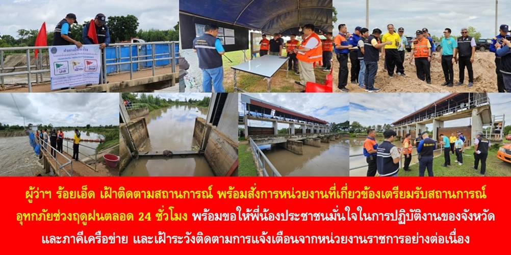 นายทรงพล กล่าวต่อไปว่า กองอำนวยการป้องกันและบรรเทาสาธารณภัยจังหวัดร้อยเอ็ด จึงได้ตั้งทีมติดตามและเฝ้าระวังสถานการณ์น้ำอย่างใกล้ชิด และได้เน้นย้ำให้ทุกพื้นที่สำรวจ ตรวจสอบความพร้อมของแนวพนังกั้นน้ำ เฝ้าระวังบริเวณจุดเสี่ยงของพนังกั้นน้ำให้อยู่ในสภาพที่คงทนแข็งแรง ซึ่งได้รับความร่วมมือจากฝ่ายปกครอง และองค์กรปกครองส่วนท้องถิ่นในแต่ละพื้นที่เพื่อทำการแจ้งเตือนหน่วยงานที่เกี่ยวข้อง รวมทั้งประชาสัมพันธ์ให้ ประชาชนเฝ้าระวังและติดตามสถานการณ์น้ำในพื้นที่อย่างใกล้ชิด โดยตน ได้มอบหมายให้นายธรณิศ เทพแพงตา หัวหน้าสำนักงานป้องกันและบรรเทาสาธารณภัยจังหวัดร้อยเอ็ด นายวสันต์ พรหมดีสาร ผู้อำนวยการโครงการชลประทานร้อยเอ็ด ผู้แทนผู้บัญชาการมณฑลทหารบกที่ 27 กองพันทหารราบที่1 กรมทหารราบที่16 หน่วยพัฒนาการเคลื่อนที่54 (นพค.54) องค์การบริหารส่วนจังหวัดร้อยเอ็ด นายอำเภอปทุมรัตต์ นายอำเภอเกษตรวิสัย นายกองค์กรปกครองส่วนท้องถิ่น กำนัน ผู้ใหญ่บ้าน และเจ้าหน้าที่ผู้เกี่ยวข้อง ร่วมลงพื้นที่สำรวจปริมาณน้ำตามลำน้ำเสียวที่ฝายยางบ้านท่าม่วง ตำบลโพนสูง อำเภอปทุมรัตต์ ฝายเขวาน้อย เขวาคำ ตำบลโนนสว่าง และบ้านต่องต้อน ตำบลกู่กาสิงห์ อำเภอเกษตรวิสัย หลังจากเกิดเหตุอาคารระบายน้ำล้นอ่างเก็บน้ำห้วยเชียงคำ ต.โนนราษี อ.บรบือ จ.มหาสารคาม ถูกกัดเซาะ ทำให้ทำนบดินระบายน้ำลงช่องอาคารระบายน้ำล้นขาดเป็นทางยาวประมาณ 50 เมตร ส่งผลให้มวลน้ำทะลักเข้าท่วมพื้นที่การเกษตรและที่อยู่อาศัยของประชาชนเป็นบริเวณกว้าง และไหลลงสู่พื้นที่ 5 ตำบล คือ ต.โนนราษี ต.กำพี้ ต.ดอนงัว ต.บัวมาศ และ ต.หนองม่วง อ.บรบือ จ.มหาสารคาม ซึ่งขณะนี้มวลน้ำดังกล่าวยังไม่ส่งผลกระทบต่อพื้นที่ทั้งด้านการเกษตรและบ้านเรือนที่อยู่อาศัยของประชาชนในพื้นที่จังหวัดร้อยเอ็ดแต่อย่างใด อย่างไรก็ตามได้เน้นย้ำให้นายอำเภอในพื้นที่ที่อาจจะได้รับผลกระทบ ได้แก่ อำเภอปทุมรัตต์ อำเภอจตุรพักตรพิมาน อำเภอสุวรรณภูมิ อำเภอโพนทราย และอำเภอหนองฮี ติดตามสถานการณ์อย่างใกล้ชิด โดยเฉพาะพื้นที่จุดเสี่ยงบริเวณลุ่มริมแม่น้ำ พร้อมทั้งประชาสัมพันธ์ข้อมูลและแจ้งเตือนประชาชนที่อาศัยอยู่ในพื้นที่ริมน้ำให้ทราบล่วงหน้า เพื่อเตรียมความพร้อมในการอพยพและเคลื่อนย้ายสิ่งของได้ทันท่วงทีหากเกิดสถานการณ์น้ำท่วมฉับพลันขึ้น โดยขอให้ปฏิบัติตามคำแนะนำของทางราชการ พร้อมเตรียมแผนเผชิญเหตุรวมทั้งอุปกรณ์ เครื่องจักรกลและกำลังพลให้มีความพร้อมสำหรับการให้ความช่วยเหลือประชาชนในท