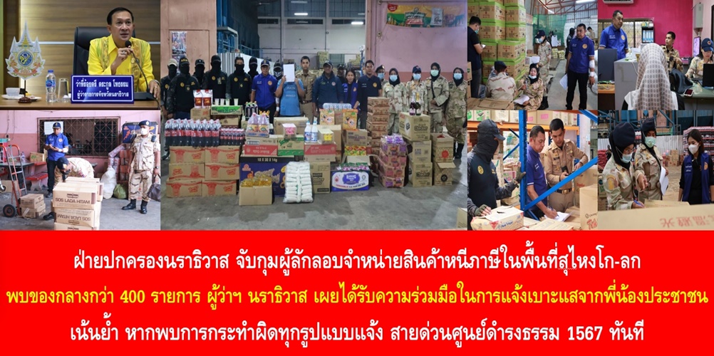 วันนี้ (21 ก.ค. 67) ว่าที่ร้อยตรี ตระกูล โทธรรม ผู้ว่าราชการจังหวัดนราธิวาส เปิดเผยว่า จังหวัดนราธิวาสได้จับกุมผู้ต้องหาลักลอบนำเข้าสินค้าที่ไม่ได้ผ่านพิธีศุลกากร พร้อมตรวจยึดสิ่งของ กว่า 400 รายการ และเอกสาร อุปกรณ์อิเล็กทรอนิกส์ และสิ่งอื่น ๆ ที่ใช้ในการประกอบธุรกิจจำหน่ายสินค้า ซึ่งตนได้มอบหมายให้ นายสุวิทย์ นาคเป้า ป้องกันจังหวัดนราธิวาส นายอัจฉริยะ เพียรทอง หัวหน้าชุดปฏิบัติการพิเศษจังหวัดนราธิวาส นายดานิยาน ปริญภัทรกุล ผู้ช่วยป้องกันจังหวัดนราธิวาส นายเอกวัตร ศรีเทศ ผบ.ร้อย อส.จ.นธ. และนางสาวพิมพ์สิริ พลภักดี ผู้ช่วยจ่าจังหวัดนราธิวาส นำกำลัง อส. ชุดปฏิบัติการพิเศษจังหวัดนราธิวาส อส. สังกัดร้อย อส.จ.นธ และ อส. สังกัด ร้อย บก.บร.จ.นธ. เข้าตรวจสอบตามหมายค้นศาลจังหวัดนราธิวาสที่ 44/2567 ณ โกดังอาดัม การค้า อ.สุไหงโก-ลก ตามข้อร้องเรียนของประชาชนในพื้นที่ ว่า มีการลักลอบจำหน่ายสินค้าที่ยังมิได้ผ่านพิธีศุลกากร จังหวัดนราธิวาส โดยที่ทำการปกครองจังหวัดนราธิวาส กลุ่มงานความมั่นคง จึงได้สั่งการให้ชุดปฏิบัติการพิเศษฝ่ายปกครองจังหวัดนราธิวาส ออกทำการสืบสวนและตรวจสอบข้อเท็จจริงเป็นเวลา 2 เดือน จนเป็นที่แน่ชัดแล้วว่าภายในโกดังหลังดังกล่าวได้มีสิ่งของผิดกฎหมาย จึงได้ดำเนินการขอหมายค้นจากศาลจังหวัดนราธิวาส เพื่อตรวจค้นและยึดสิ่งของ เอกสาร อุปกรณ์อิเล็กทรอนิกส์ และสิ่งอื่น ๆ ที่ใช้ในการประกอบธุรกิจจำหน่ายสินค้าที่ยังมิได้ผ่านพิธีการศุลกากร หรือ พบสิ่งของที่ใช้เป็นพยานหลักฐานประกอบการสอบสวน หรือของซึ่งมีไว้เป็นความผิดหรือได้มาเป็นความผิด หรือ ได้ใช้ หรือ ตั้งใจจะใช้ในการกระทำผิด