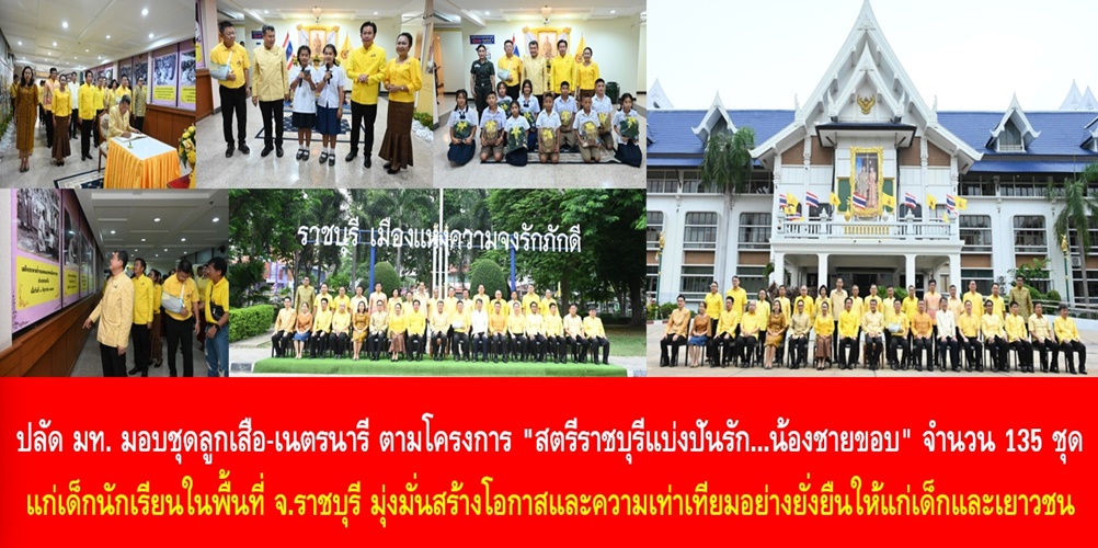 วันนี้ (22 ก.ค. 67) เวลา 11.15 น. ที่บริเวณห้องโถง ชั้น 1 ศาลากลางจังหวัดราชบุรี ตำบลหน้าเมือง อำเภอเมืองราชบุรี จังหวัดราชบุรี นายสุทธิพงษ์ จุลเจริญ ปลัดกระทรวงมหาดไทย เป็นประธานพิธีมอบชุดลูกเสือ-เนตรนารี ให้กับผู้แทนนักเรียนตามโครงการ “สตรีราชบุรีแบ่งปันรัก…น้องชายขอบ” พร้อมรับชมนิทรรศการเฉลิมพระเกียรติพระบาทสมเด็จพระเจ้าอยู่หัว โดยมี นายขจร ศรีชวโนทัย อธิบดีกรมส่งเสริมการปกครองท้องถิ่น นายสมชัย เลิศประสิทธิพันธ์ รองอธิบดีกรมการปกครอง นายชยชัย แสงอินทร์ รองอธิบดีกรมการพัฒนาชุมชน นายสหรัฐ วงศ์สกุลวิวัฒน์ รองอธิบดีกรมป้องกันและบรรเทาสาธารณภัย โดย นายเกียรติศักดิ์ ตรงศิริ ผู้ว่าราชการจังหวัดราชบุรี นางพรศรี ตรงศิริ ประธานแม่บ้านมหาดไทยจังหวัดราชบุรี นายปิยพงศ์ ชูวงศ์ นางสาววริษฐา สงวนเสริมศรี นายณัชวันก์ อัลภาชน์ เตชะเสน รองผู้ว่าราชการจังหวัดราชบุรี หัวหน้าส่วนราชการ ข้าราชการ คณะกรรมการพัฒนาสตรีจังหวัดราชบุรี คณะครูและนักเรียนโรงเรียนตำรวจตระเวนชายแดนบ้านถ้ำหินและโรงเรียนตำรวจตระเวนชายเเดนบ้านตะโกปิดทอง อำเภอสวนผึ้ง จังหวัดราชบุรี ร่วมพิธี